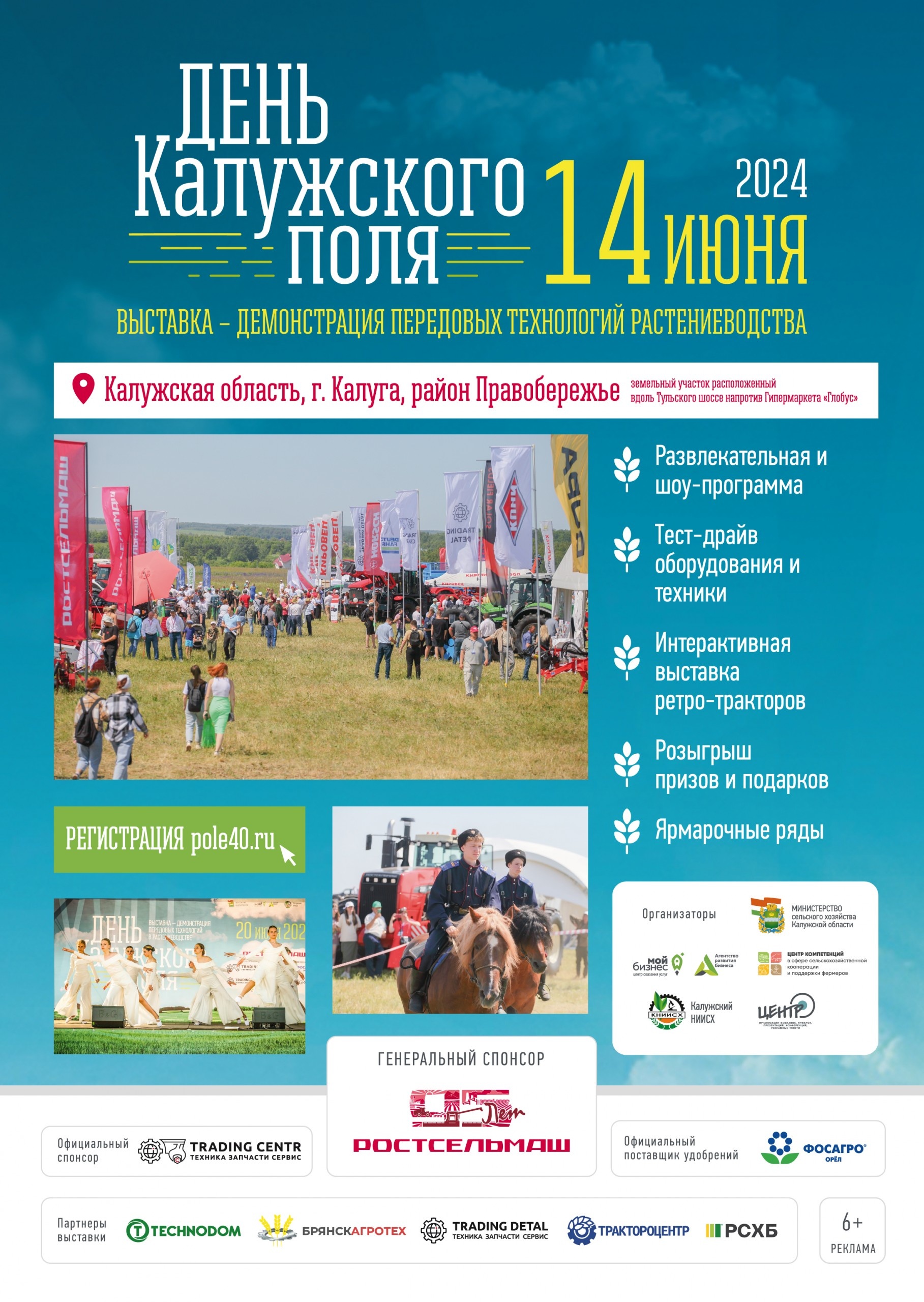 Ежегодно мероприятие «День Калужского поля» собирает аграриев региона и приглашённых гостей. В этом году выставка пройдет в 19 раз, участие в ней принимают более 50 компаний, которые представят более 100 единиц техники, новые удобрения, семена. Традиционно выставку посещают около тысячи профессионалов аграрной сферы.