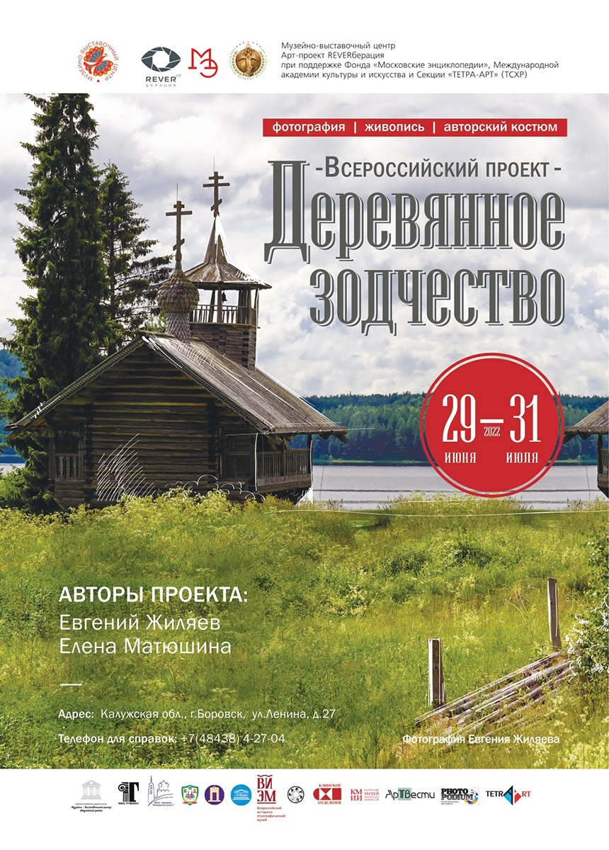 Проект зародился в 2019 году и впервые был представлен в Управлении социальной защиты ЦАО г. Москвы. Первый тур Всероссийского проекта «Деревянное зодчество» был показан в 2020-2021 гг. в Москве, Медыни, Торжке и Солнечногорске. Авторы и кураторы проекта – Евгений Жиляев и Елена Матюшина – обладатели золотой медали международного конкурса “Art Excellence Awards“ 2021. Второй тур Всероссийского проекта «Деревянное зодчество» стартовал в 2022 году! В течение года он будет показан в Люберцах, Калуге, Боровске и Коломне. Примечательно, что 2022 год Указом Президента РФ объявлен годом культурного наследия народов России.