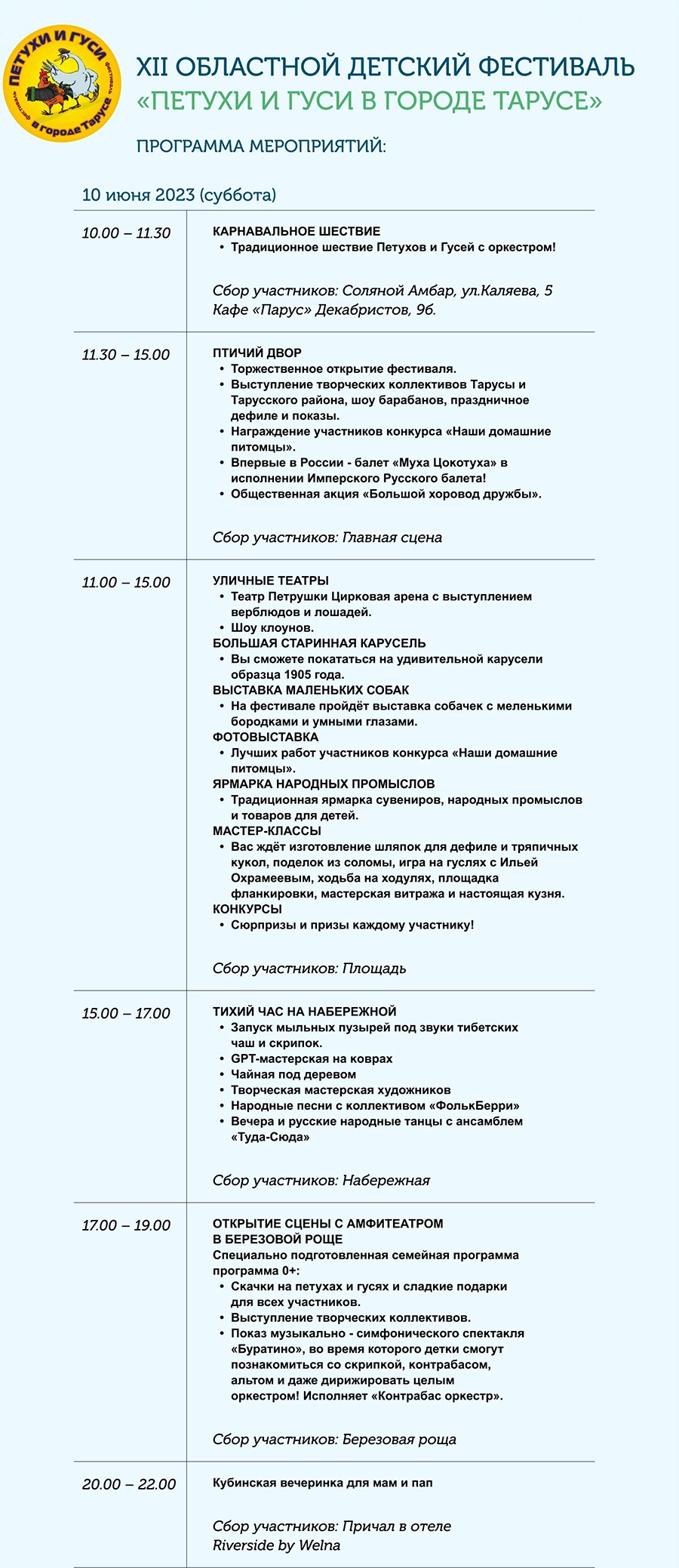 Детский фестиваль «Петухи и гуси в городе Тарусе» входит в календарь регионального проекта «Сельское лето. Отдыхай в Калужской области» и организуется при поддержке областного министерства культуры и туризма.