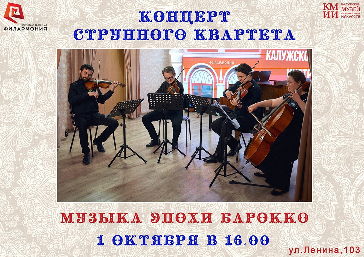 - 1 октября в 16.00 в рамках Дней Эрмитажа в Калуге состоится концерт Струнного квартета Калужской областной филармонии «Музыка эпохи барокко». - Красный зал ИОВЦ. Стоимость билетов: для взрослых - 100р., льготный - 50 р.