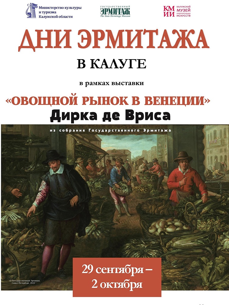 Четыре дня, с 29 сентября по 2 октября – столько продлится в этом году акция «Дни Эрмитажа в Калуге», которую организует Калужский музей изобразительных искусств в сотрудничестве с Государственным Эрмитажем. Почитателям высокого искусства предлагаются мероприятия по рубрикам: «Эрмитажный кинотеатр», «Эрмитажная библиотека», «Эрмитажный лекторий», «Эрмитаж тут рядом». Центральным экспонатом акции станет картина нидерландского художника эпохи Ренессанса Дирка де Вриса «Овощной рынок в Венеции», которая экспонируется в Калуге до 2 октября.