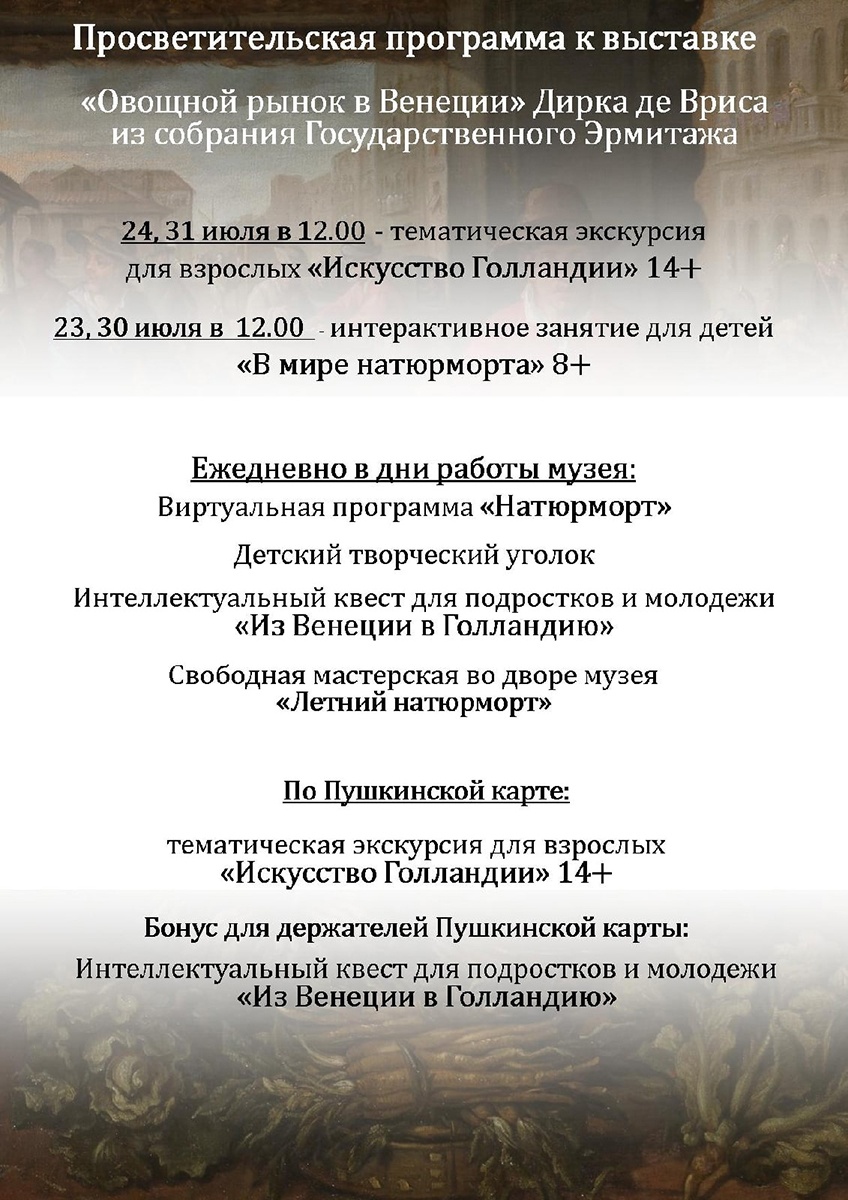 В просветительской программе к выставке «Овощной рынок в Венеции» Дирка де Вриса: тематические экскурсии 24 и 31 июля, интерактивные занятия, свободная мастерская, виртуальная выставка, интеллектуальные квесты. Подробности смотрите на анонсе в галерее к событию.