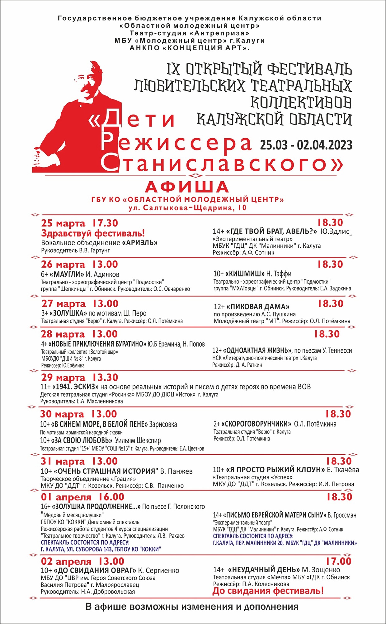 14 спектаклей для детей, подростков, юношества и взрослых – такова афиша 9-го Открытого фестиваля любительских театральных коллективов Калужской области «Дети режиссёра Станиславского», который проводится с 25 марта по 2 апреля в Областном молодежном центре.