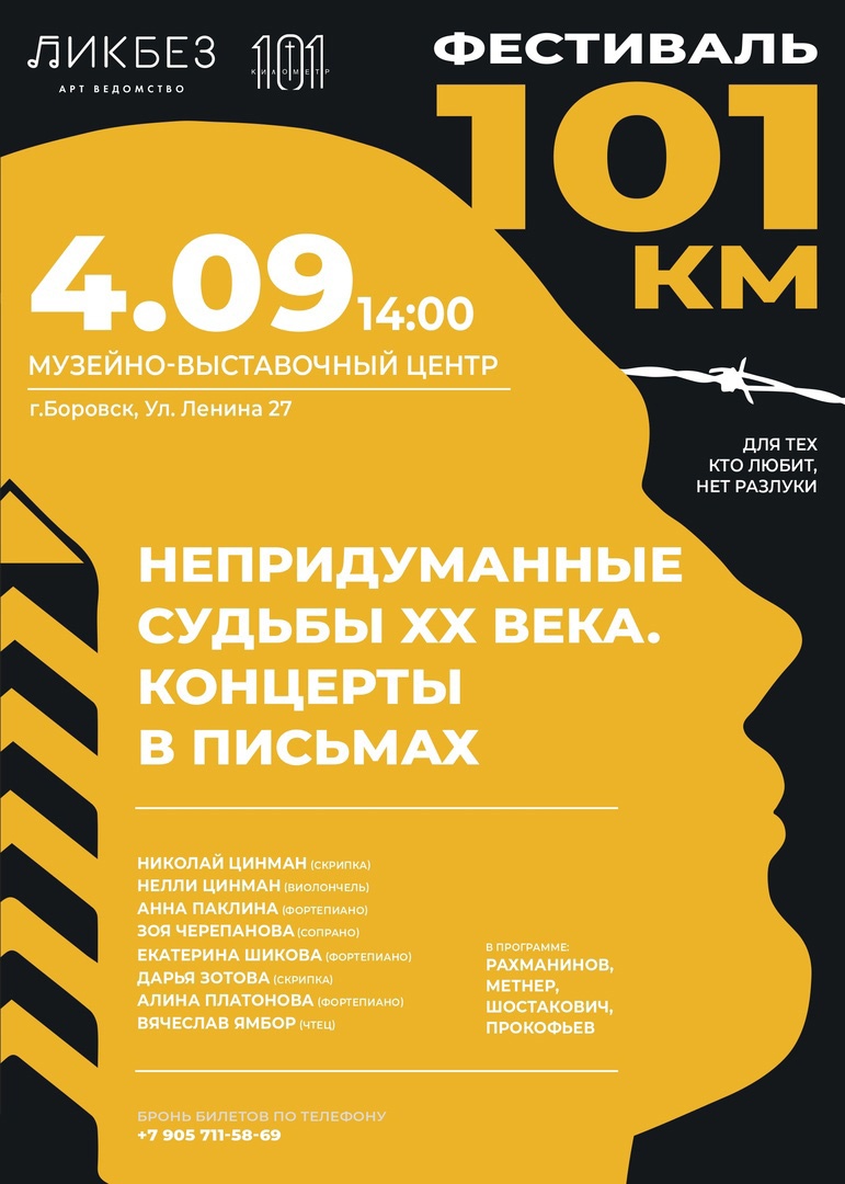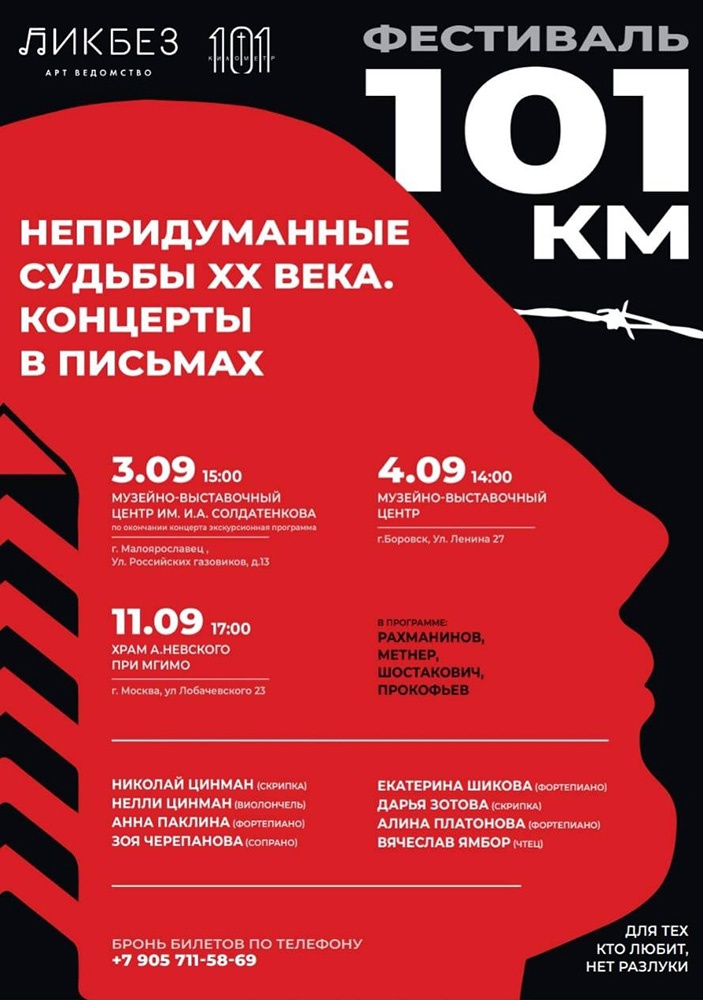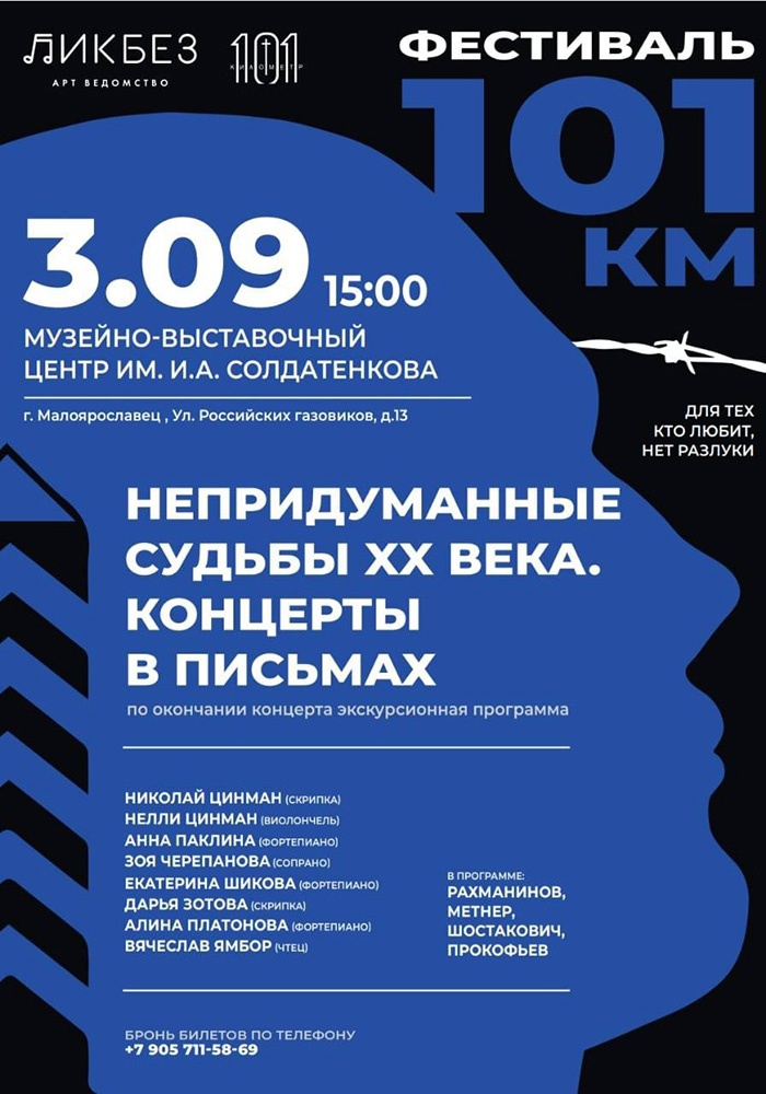 3 сентября в Малоярославце, а 4 сентября в Боровске состоятся концерты в рамках культурно-исторического фестиваля «101 км». Проект представляет собой серию концертных программ с символическим названием «Непридуманные судьбы ХХ века. Концерт в письмах».