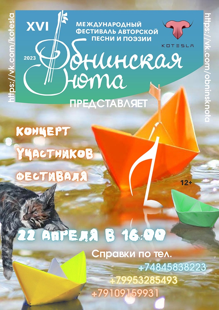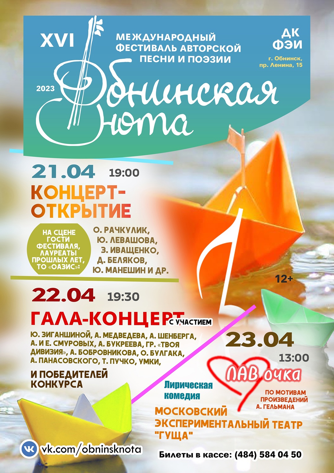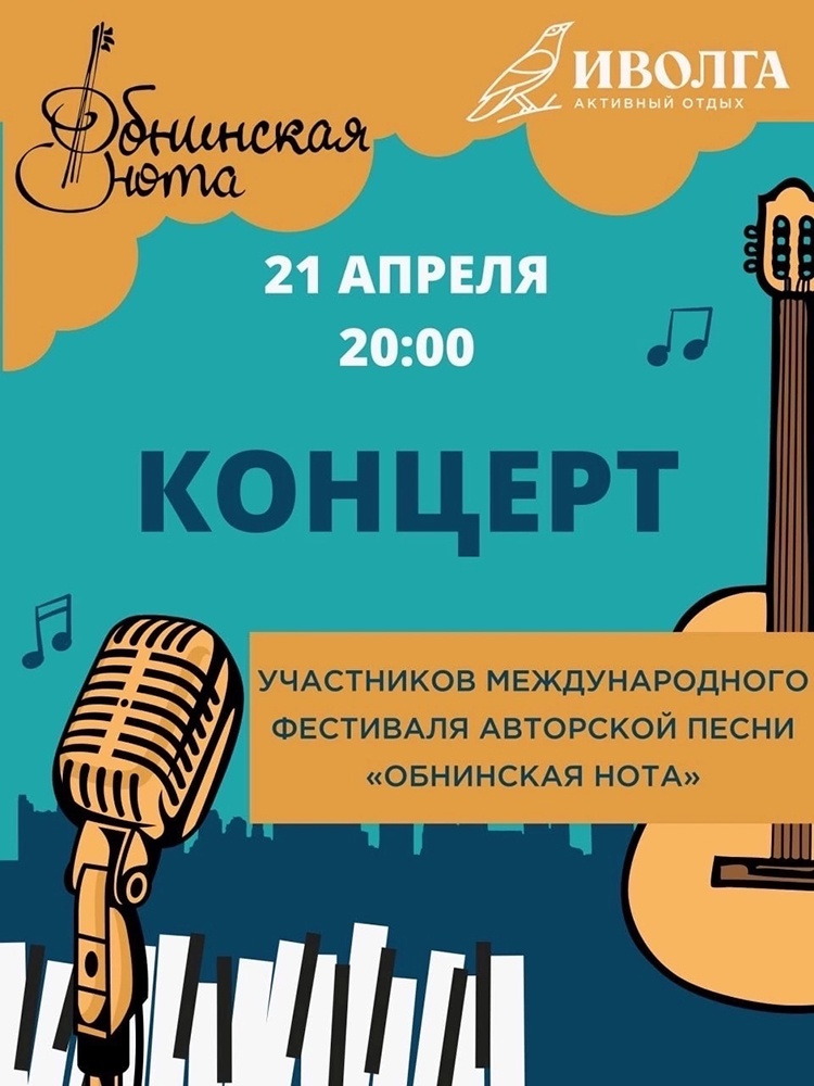 С 21 по 23 апреля калужский наукоград приглашает на Международный фестиваль авторской песни и поэзии «Обнинская нота – 2023», главной площадкой которого традиционно станет ДК ФЭИ. В программе творческий конкурс, концерты гостей и участников, вечер знакомства "Гитара по кругу", "Свободный микрофон", мастер-классы, спектакль "Лавочка" Московского экспериментального театра "Гуща", а также экскурсии и традиционные субботние посиделки для участников.