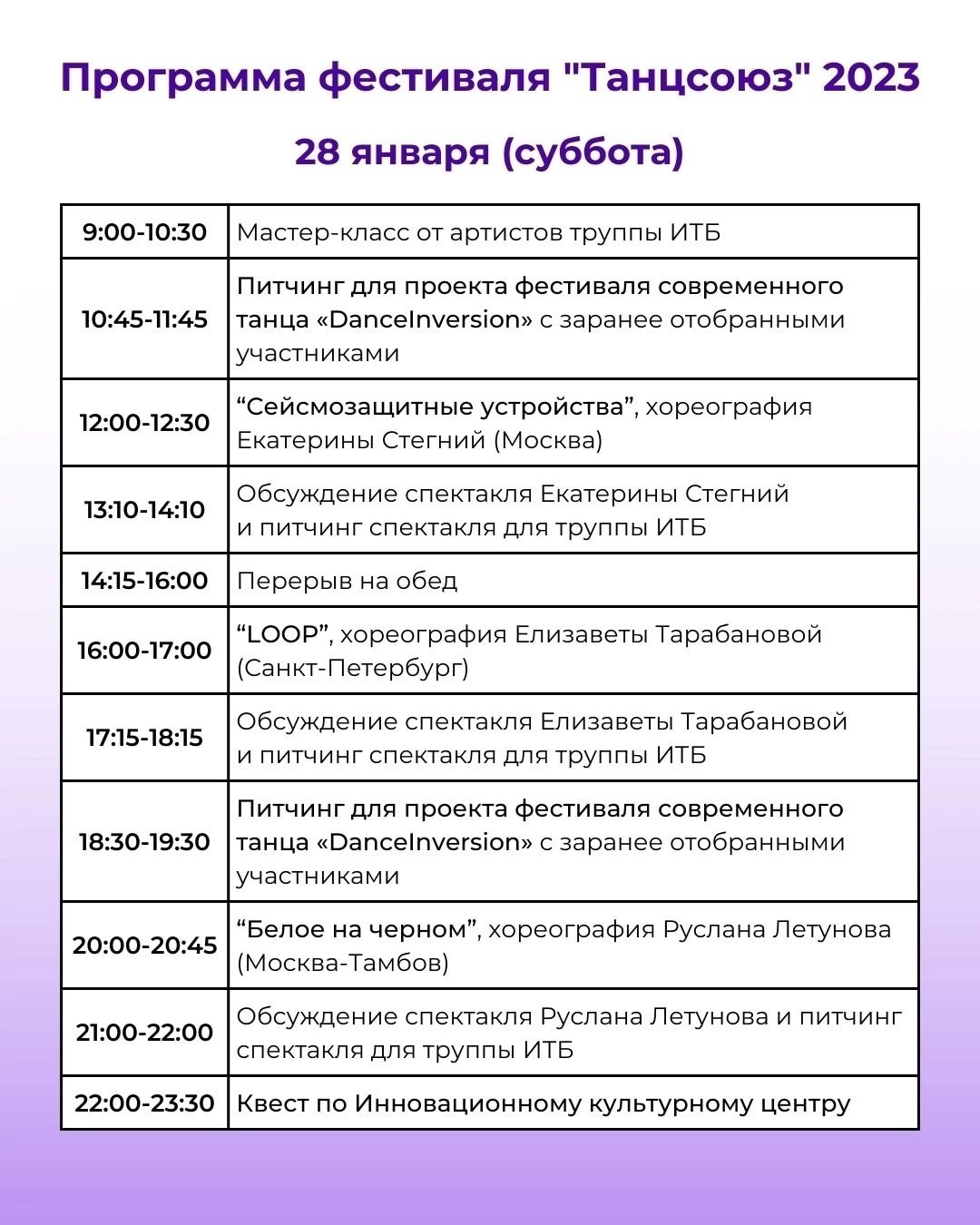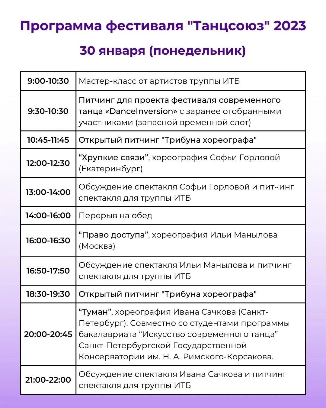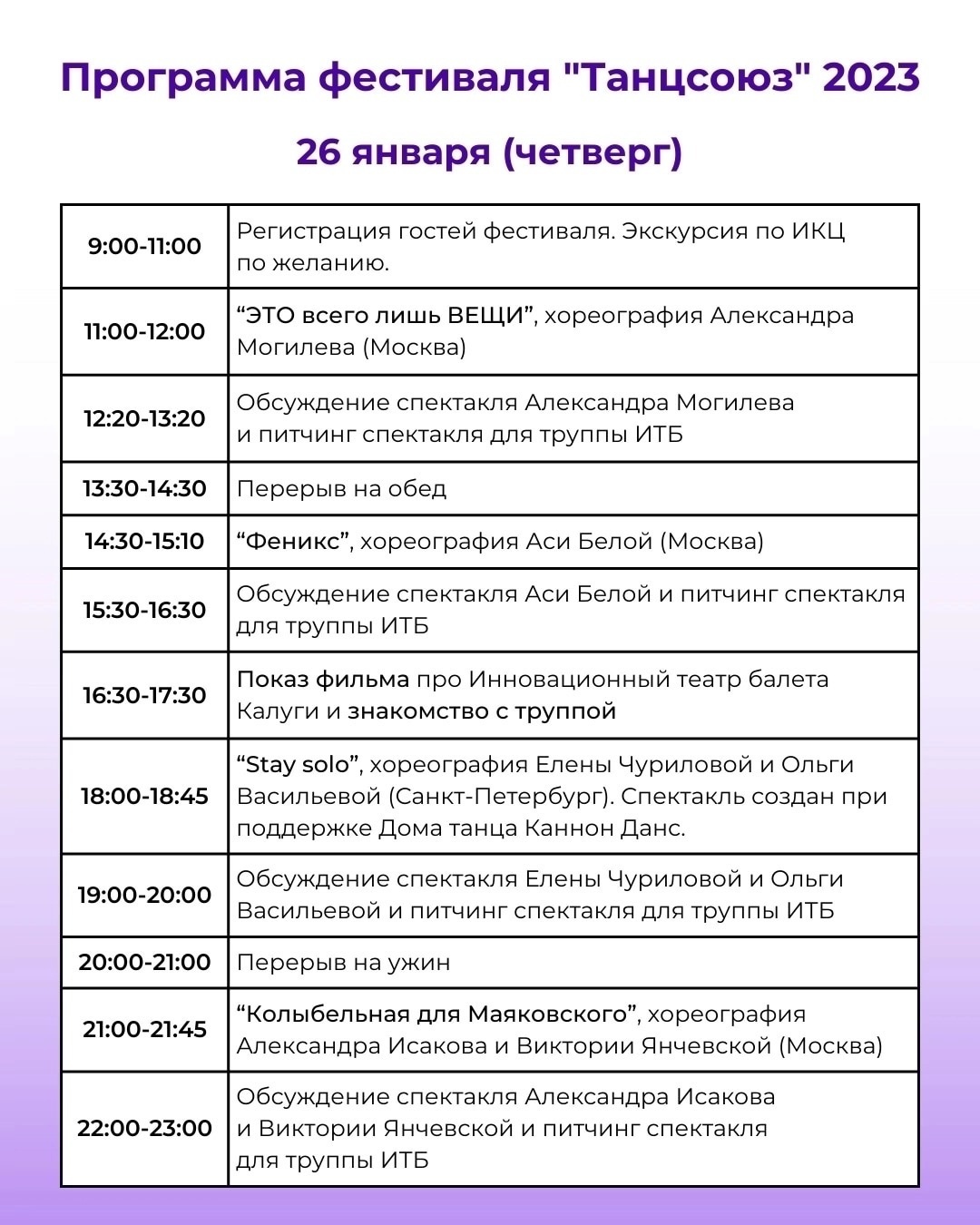 Кроме просмотра спектаклей, зрители смогут принять участие в обсуждениях работ хореографов, потанцевать на утренних мастер-классах от артистов труппы Инновационного театра балета, увидеть выставку фотографа Владимира Луповского «Разные поезда», посвященную искусству танца.