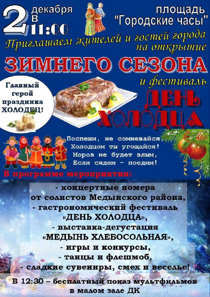 Медынь захватила инициативу начать программу нового событийного проекта региона – «Калужской зимы», а заодно и открыть зимний туристический сезон в Калужской области. 2 декабря на площади «Городские часы» организуется День холодца.