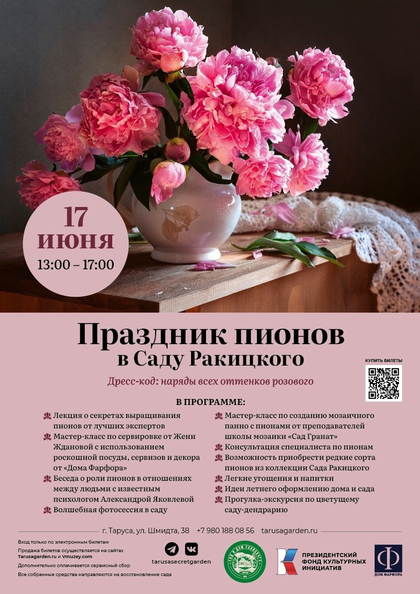 Сад и дом Ракицкого в Тарусе продолжает серию творческих мастерских. 17 июня здесь отметят праздник пионов. Гости узнают всё об этих нежных цветах от человека, который обожает пионы – это создатель Аптекарского огорода Алексей Ретеюм. В программе также мастер-класс по созданию мозаичного панно, фотосессии, а хозяйка усадьбы дизайнер Евгения Жданова поделится оригинальными идеями оформления дома и сада.