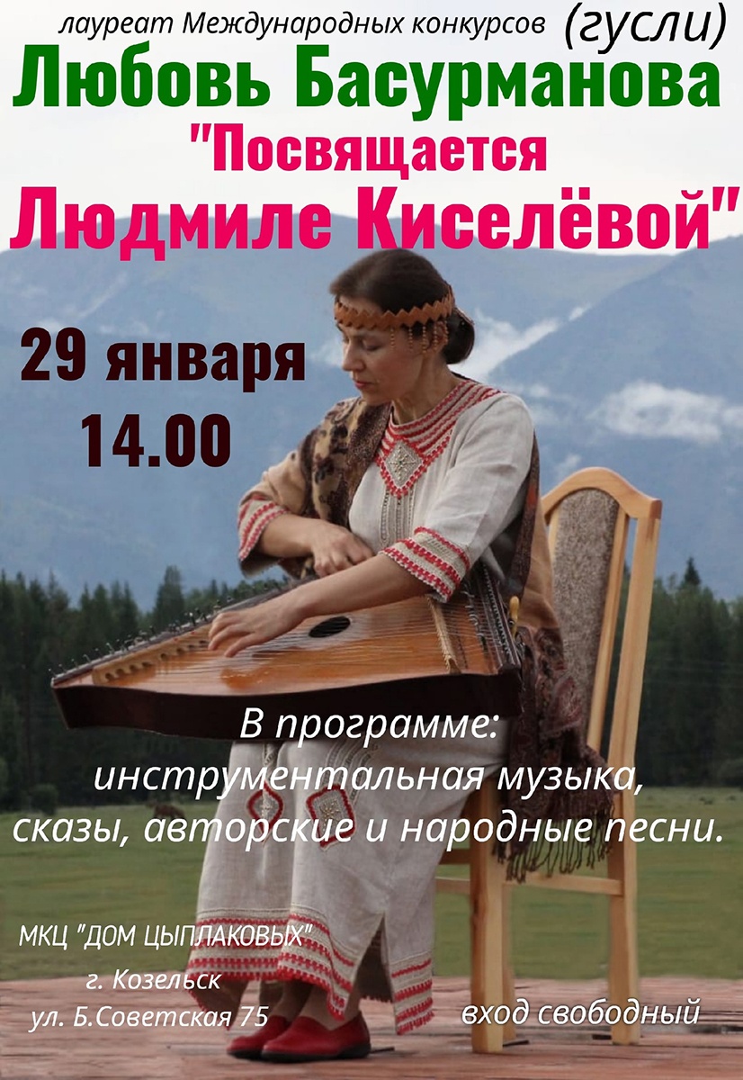 ОТМЕНА мероприятия!!! 29 января в 14:00 в рамках выставки в Доме Цыплаковых состоится выступление лауреата международных конкурсов, певицы, композитора, исполнительницы на современных концертных гуслях - Любови Басурмановой. Прозвучат инструментальная музыка, сказы, авторские и народные песни. вход на концерт свободный.