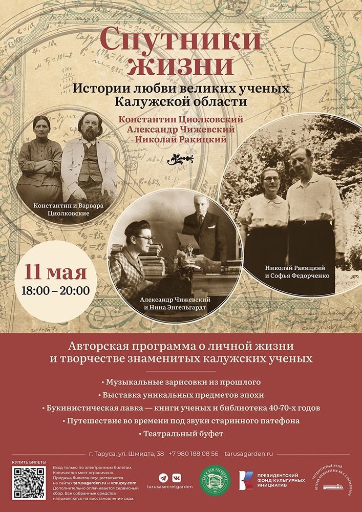 Калужская область богата не только достопримечательностями, но и людьми, оказавшими влияние на науку, культуру и творчество России. 11 мая в саду Ракицкого в Тарусе состоится премьера программы «Спутники жизни»: со сцены зеленого театра гостям расскажут три удивительные истории любви известных калужских ученых – Константина Циолковского, Александра Чижевского и Николая Ракицкого.