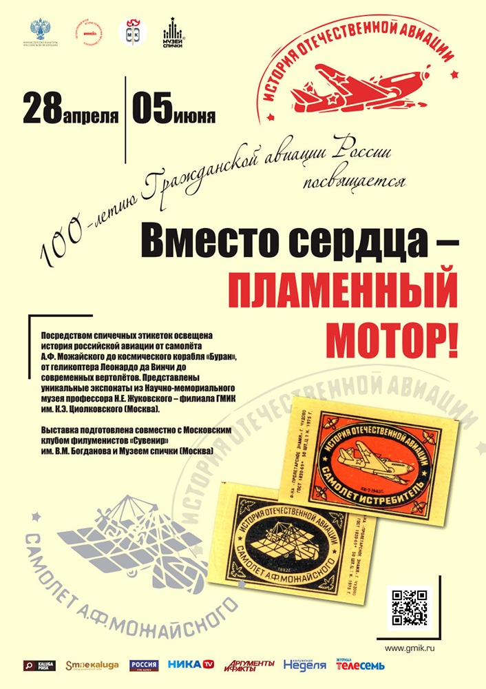 Авиация напрямую связана с космонавтикой – первый набор в отряд космонавтов производился среди лётчиков и парашютистов. В 2023 году российская авиация отмечает 100 лет! С 29 апреля в Государственном музее истории космонавтики имени К.Э. Циолковского работает выставка «Вместо сердца – пламенный мотор!». Это совместный проект ГМИК имени К.Э. Циолковского и московских филуменистов. Известные строки «Марша авиаторов» не случайно стали названием выставки. В центре экспозиции – спичечные этикетки по теме авиации. Сердце самолета, его пламенный мотор символизирует пламя спички.