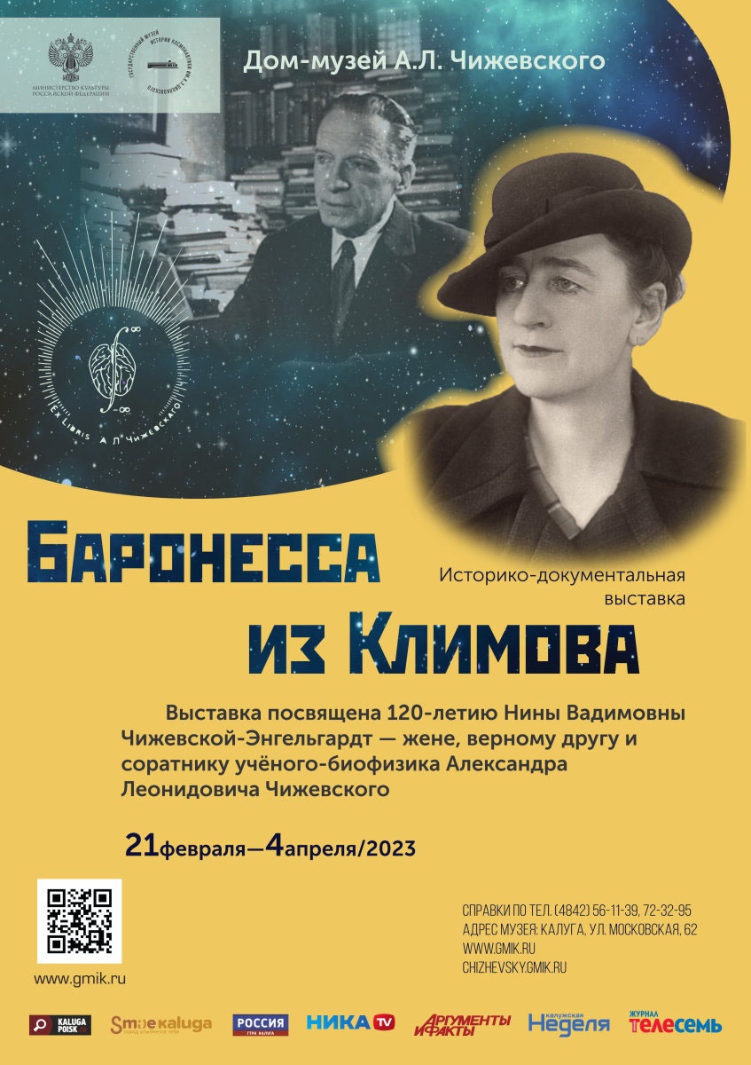 Преданная своему Мастеру Маргарита, актриса, секретарь-машинистка, баронесса, обвиненная в шпионаже… Знаете, кому выпало пройти такой трудный жизненный путь? Нине Вадимовне Чижевской-Энгельгардт – жене, верному другу и соратнику учёного-биофизика Александра Леонидовича Чижевского. К 120-летию этой сильной и талантливой женщины Дом-музей А.Л. Чижевского подготовил выставку «Баронесса из Климова», которая открылась 21 февраля.