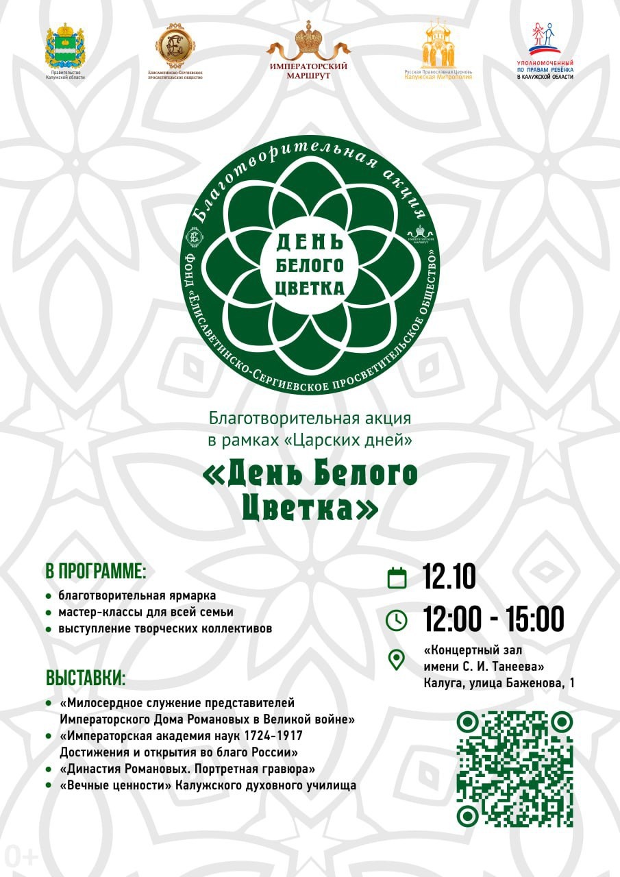 12 октября 2024 года в Концертном зале им. С.И.Танеева (г. Калуга, ул. Баженова, д. 1) состоится Благотворительная акция «Белый цветок».