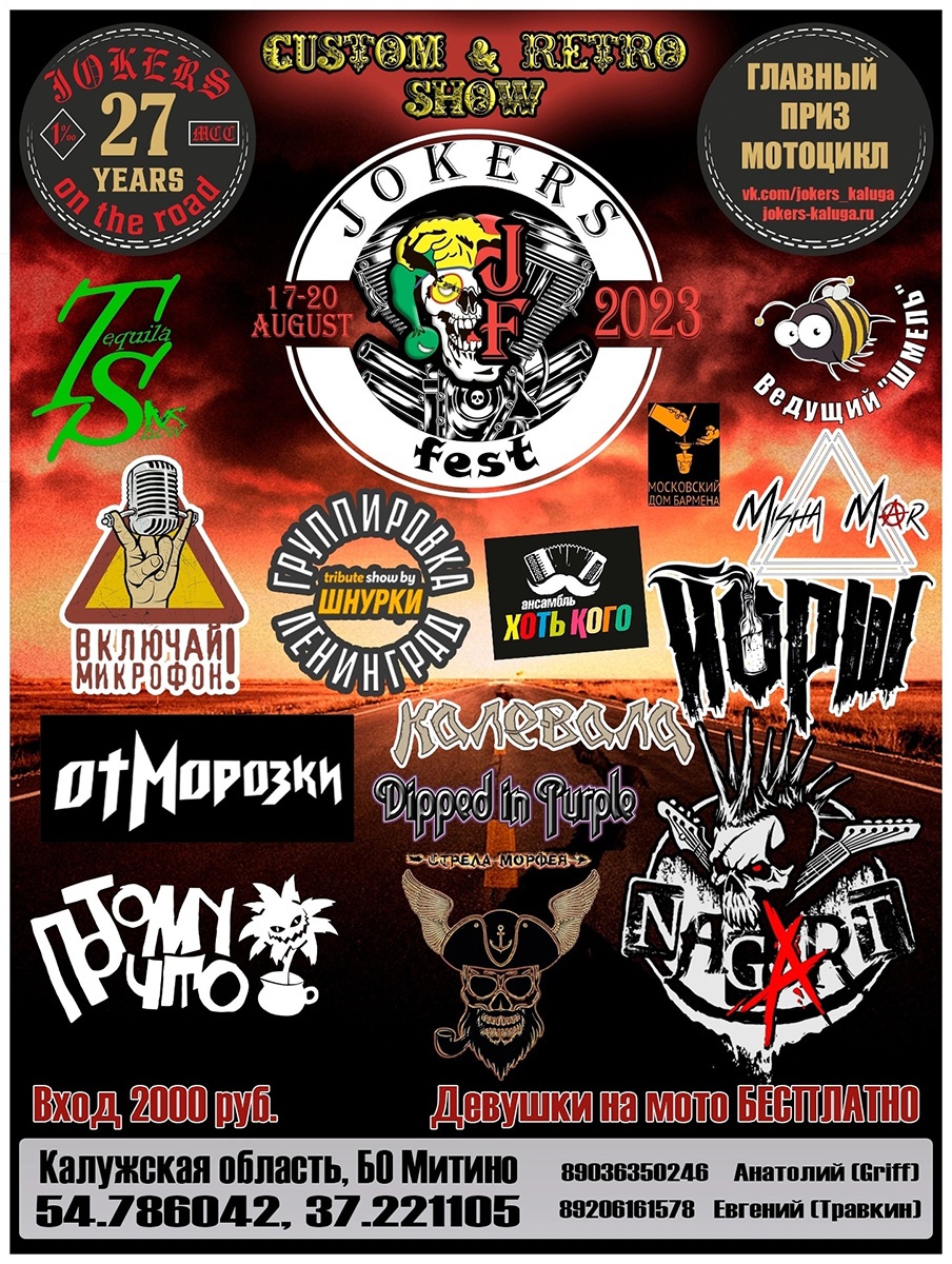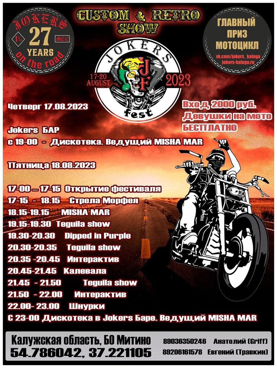 Мотоклуб Jokers MCC отметит день рождения на базе отдыха «Митино» масштабным фестивалем с драйвовой музыкой, шумными конкурсами и зажигательными шоу. Вечеринка у Джокеров в честь 27-летия растянется на четыре дня – с 17 по 20 августа.