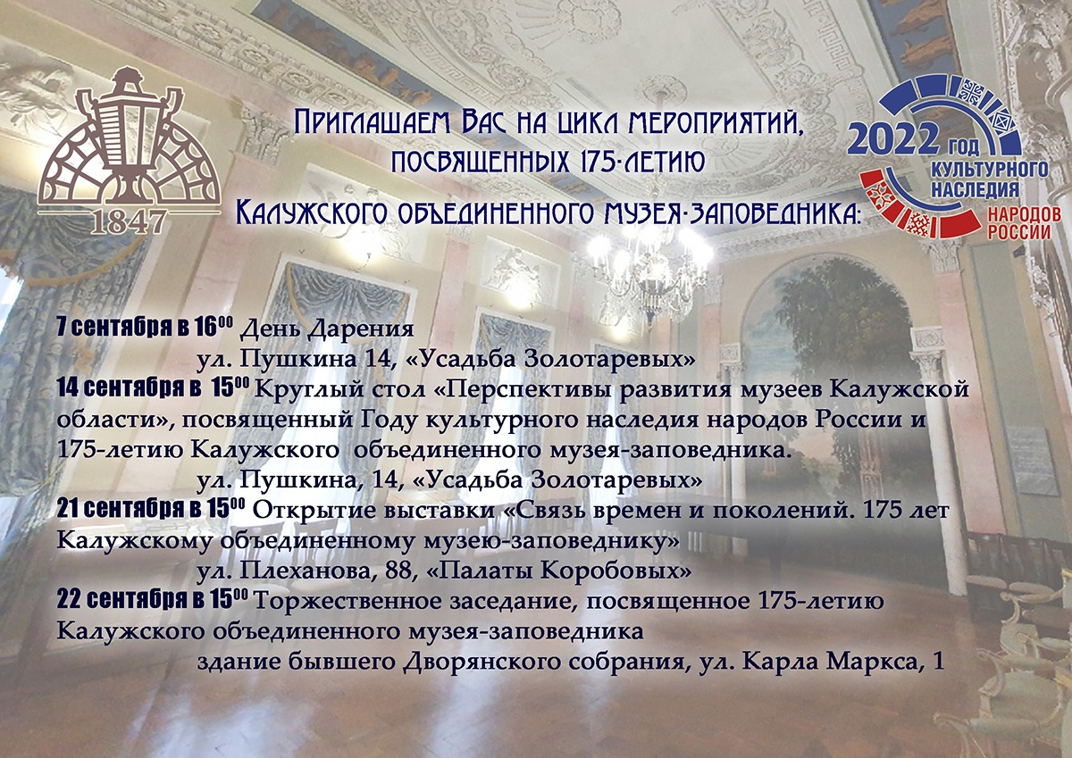 22 сентября в 15:00 часов в здании бывшего Дворянского собрания, где располагался первый губернский музеум, состоится торжественное заседание к годовщине Калужского объединенного музея-заповедника.