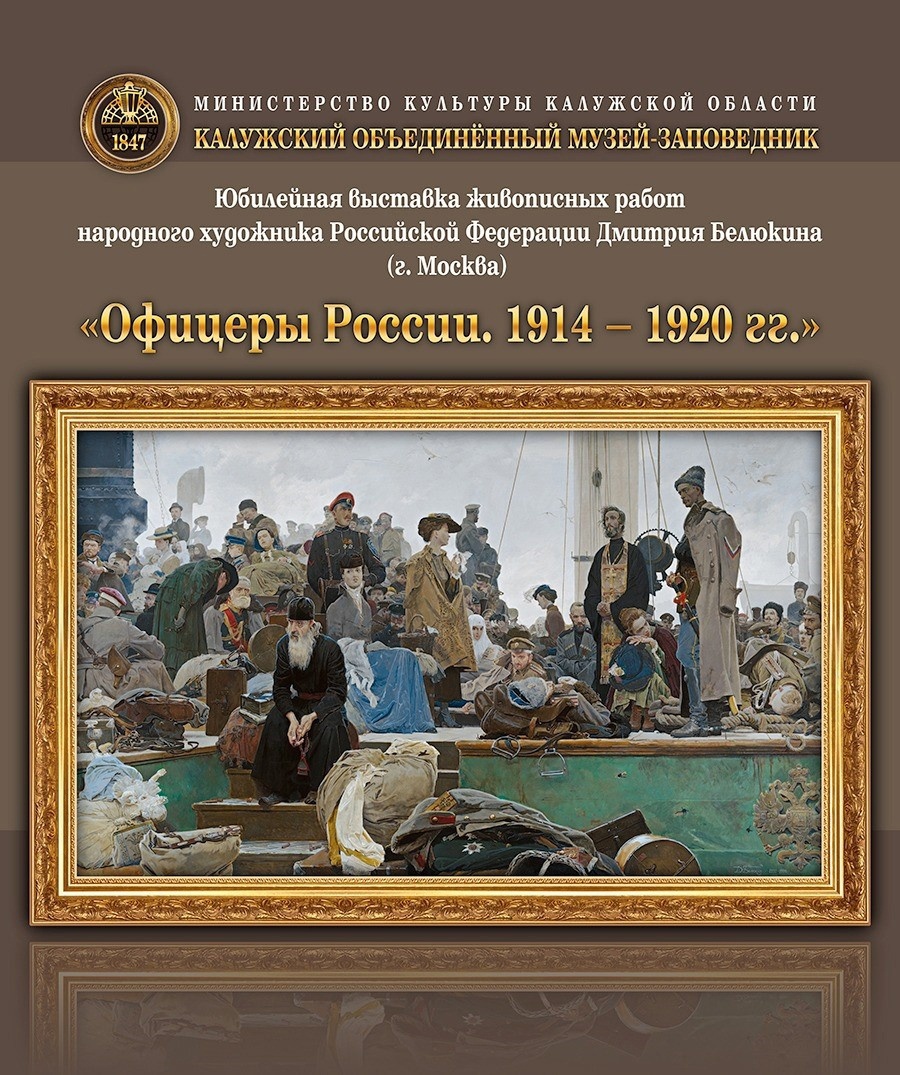 Выставка мастера исторического сюжета Дмитрия Белюкина «Офицеры России. 1914-1920 гг.» начинает работу 24 июня в козельском музейно-краеведческом центре «Дом Цыплаковых». Представлена копия одной из самых значительных в военной тематике работ Дмитрия Белюкина «Белая Россия. Исход» и еще 40 подлинных живописных и графических эскизов к ней.