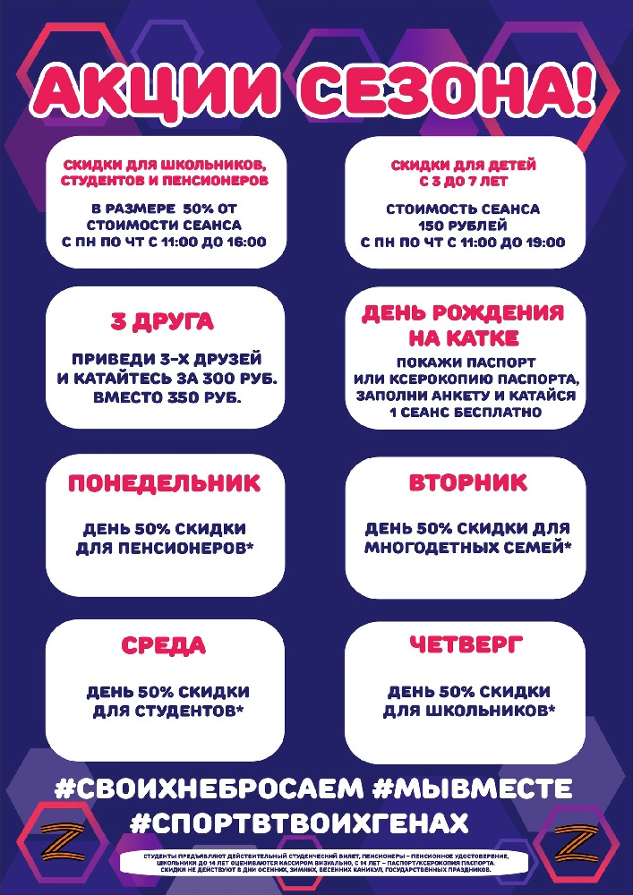 На катке "Любимый" всегда действует много акций и скидок. Например, для тех, кто привел с собой друзей. Актуальные акции на вложенном файле.