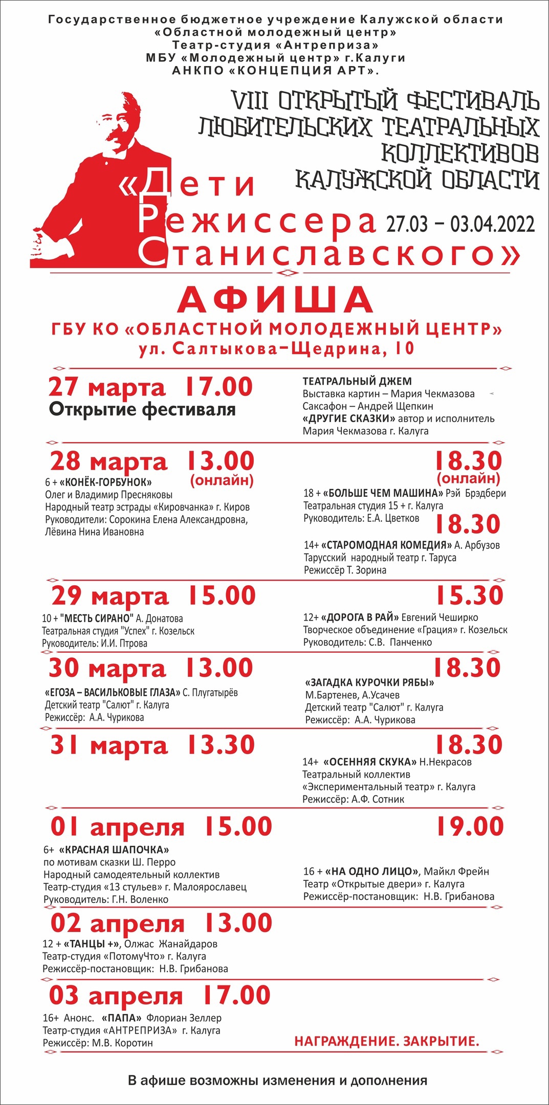 Неделя любительского театра ожидает калужан с 27 марта по 3 февраля - в эти дни в Калуге пройдут показы ежегодного открытого фестиваля любительских театральных коллективов Калужской области «Дети режиссёра Станиславского». В 2022 году фестиваля пройдет уже в 8-й раз.