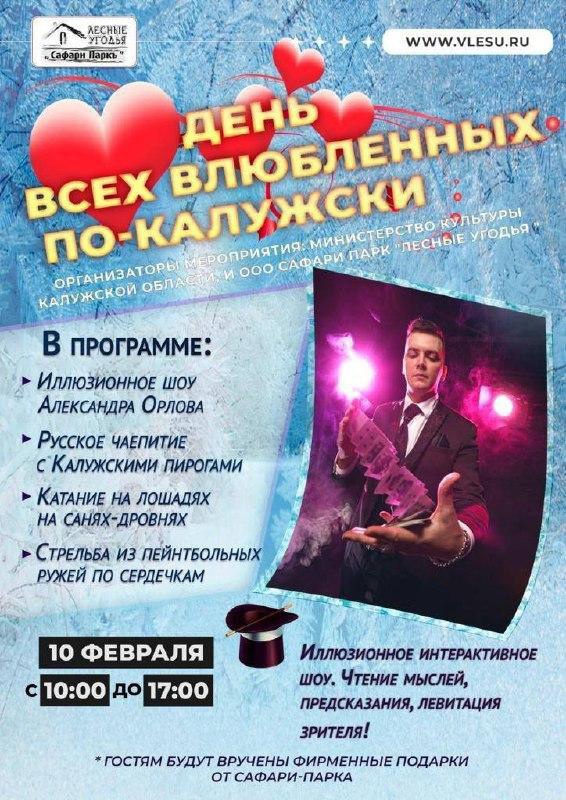 День всех влюбленных по-калужски организуют в Износковском районе в рамках регионального событийного проекта «Калужская зима». Романтичный праздник устривают 10 февраля на базе отдыха «Сафари Парк».