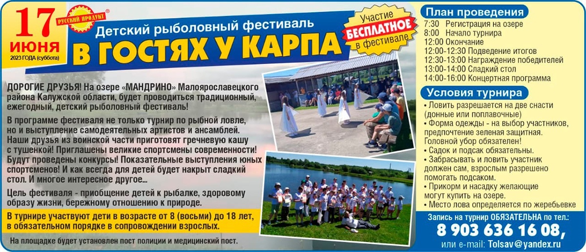 Хотите научить ребенка удить рыбу? Участвуйте в ежегодном детском рыболовном фестивале «В гостях у Карпа», который проводится 17 июня на озере Мандрино Малоярославецкого района. Лучшие ловцы получат призовые кубки, однако праздник ожидает всех участников – концерт, игровая программа и сладкий стол. Участие бесплатное.