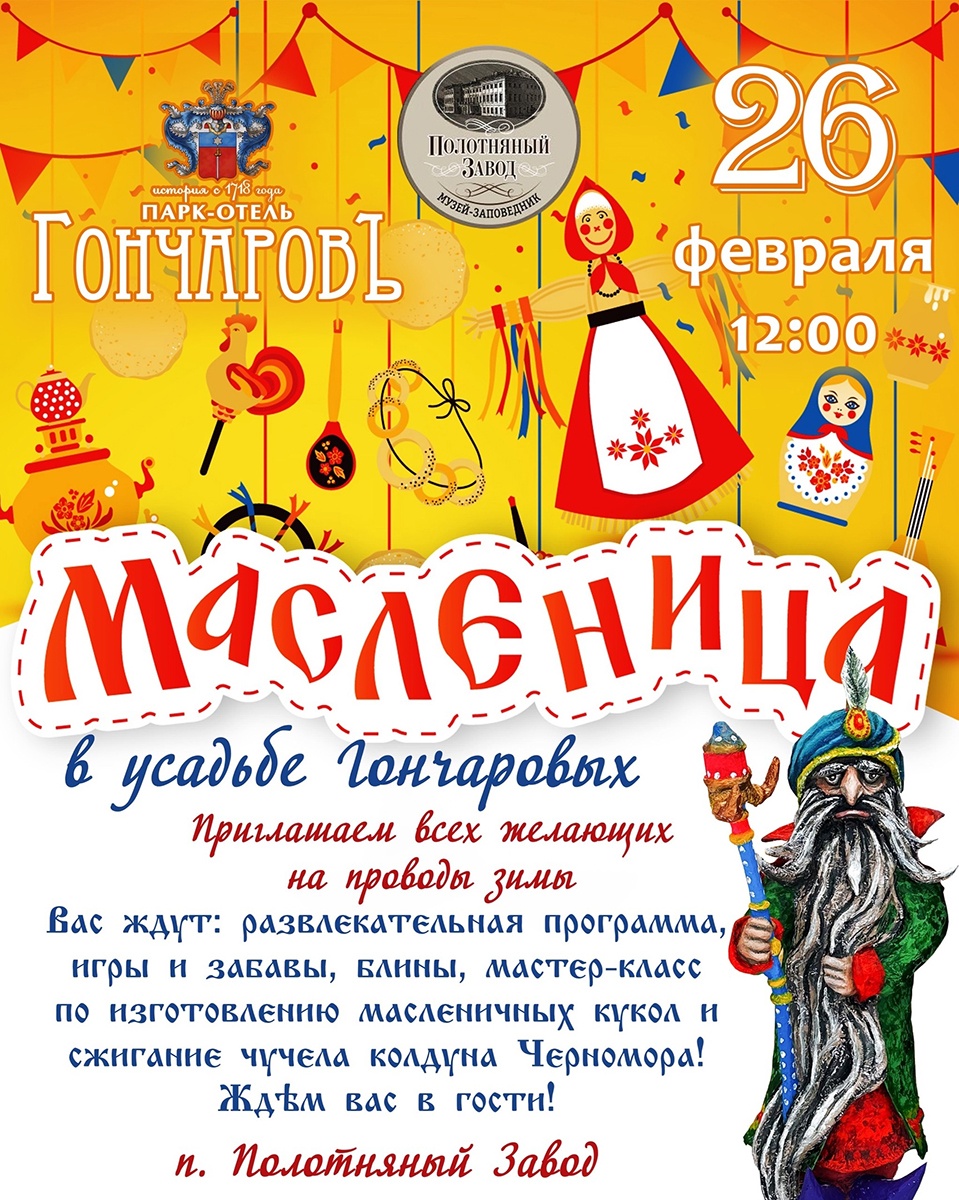 Проводы зимы в Усадьбе Гончаровых состоятся 26 февраля. Начало программы - в 12:00, вас ждут развлекательная программа, игры и забавы, блины, мастер-класс по изготовлению масленичных кукол и сжигание чучела колдуна Черномора! Вход свободный.