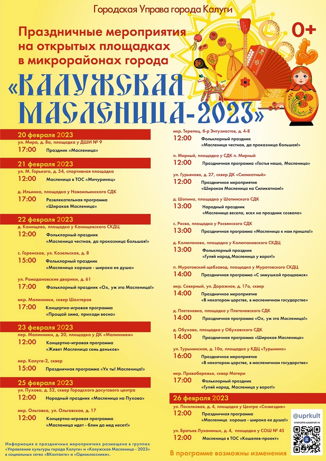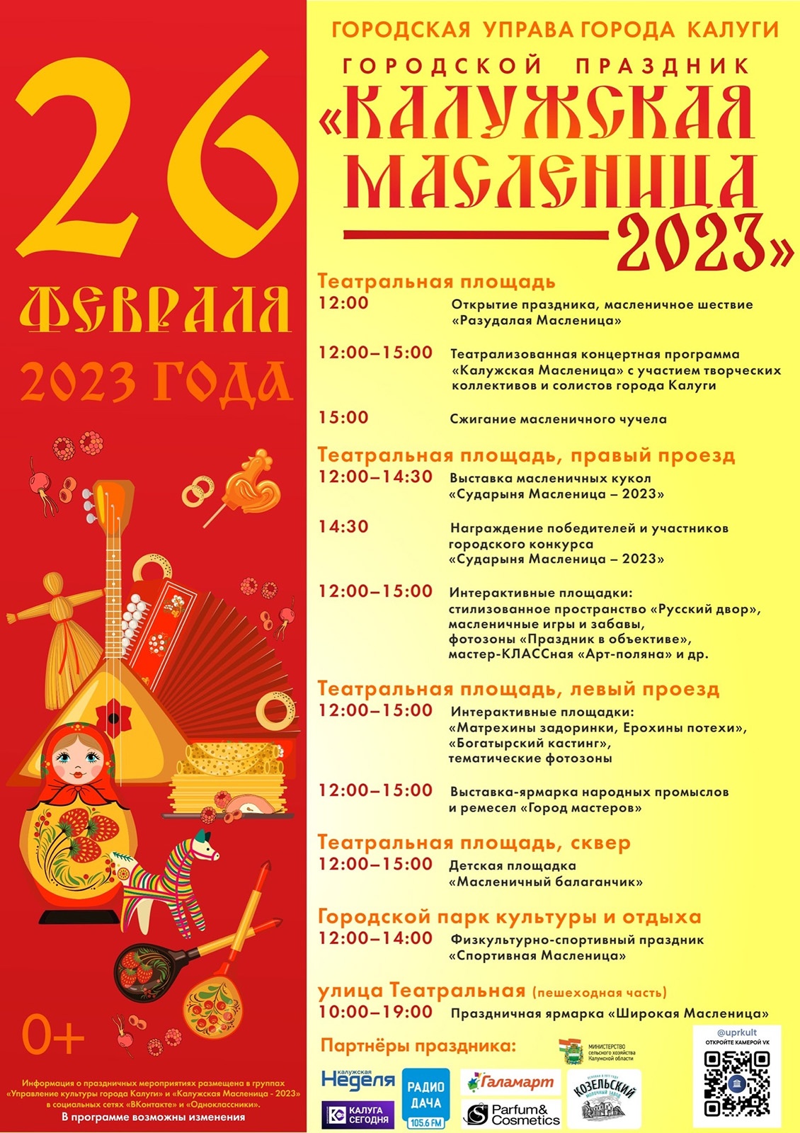 Программу «Калужская Масленица – 2023» с 20 по 26 февраля смотри в афишах в галерее события.