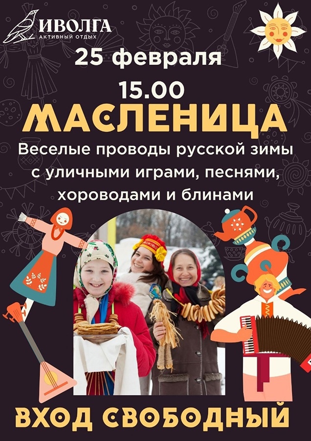 В субботу 25 февраля Масленицу традиционно отмечают на базе активного отдыха "Иволга", с. Спас-Прогнанье. Уютная база, красивая природа, свежий воздух – идеальная атмосфера для проводов зимы, который пройдут с участием профессиональных ведущих и артистов. На праздник вход свободный. Из Обнинска организуется сборный тур, телефон для записи 8-909-251-58-60.