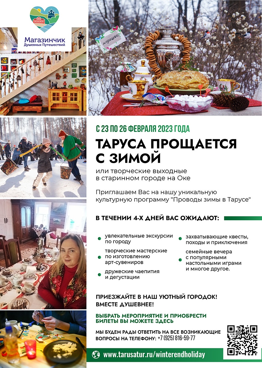 Таруса будет прощаться с зимой все длинные выходные – с 23 по 26 февраля. В городе на Оке устраивают творческие выходные: с экскурсиями по Тарусе, мастер-классами, квестами, играми и дружескими чаепитиями. Афиша с контактами в нашей галерее!