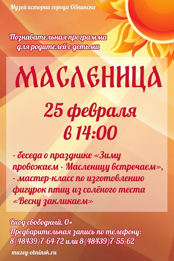 Музей истории Обнинска приглашает 25 февраля в 14:00 часов на культурно-познавательную программу. Взрослые и дети узнают, как справляли Масленицу на Руси, сколько дней ее праздновали, какое название имел каждый день праздника, познакомятся с народными обрядами и забавами. После чего участники создадут птиц из солёного теста, чтобы звать весну. Вход свободный. Предварительная запись по телефонам: +7 (48439) 7-64-72 или +7 (48439) 7-55-62.