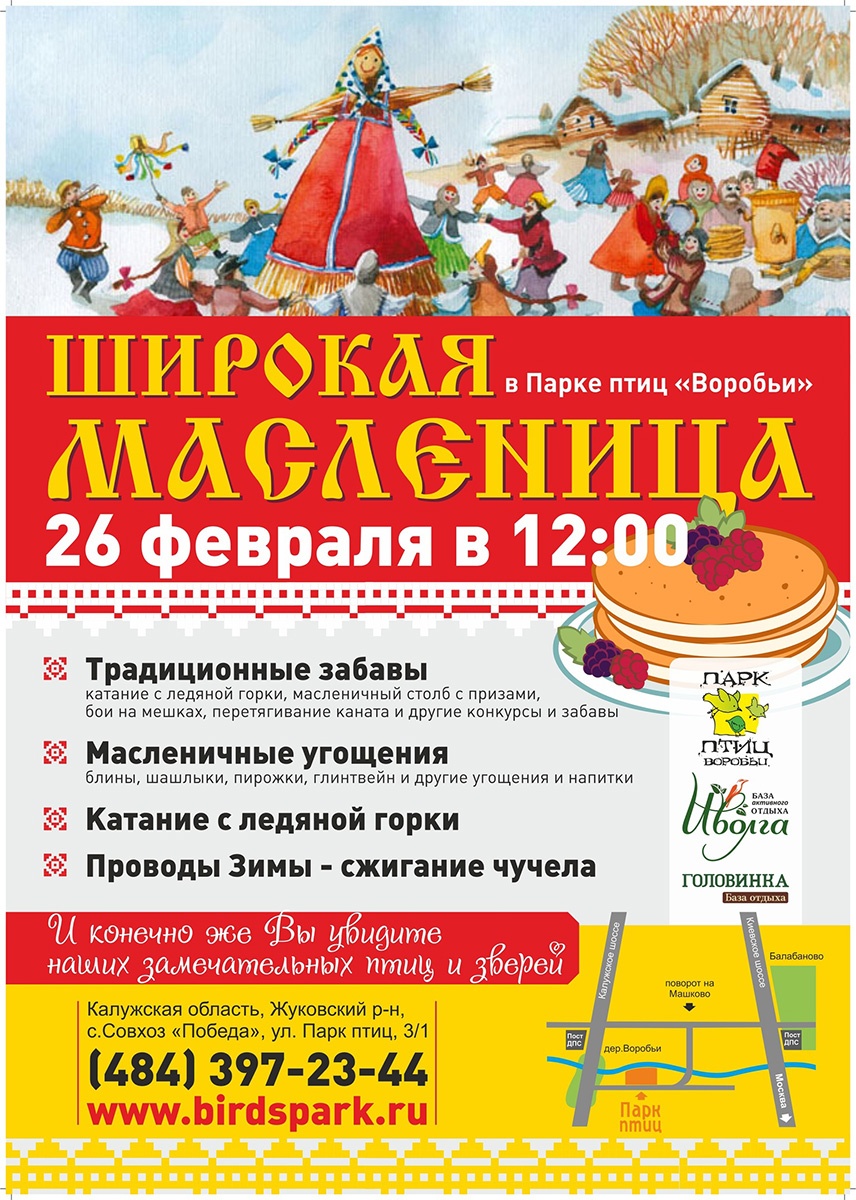 Парк птиц "Воробьи" приглашает на празднование Масленицы 26 февраля в 12:00 часов. Афишу смотрите в нашей галерее!
