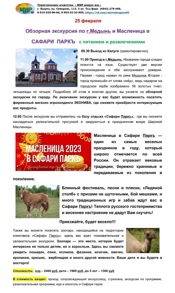Широко и весело 25 февраля отметят Масленицу на базе отдыха «Сафари Паркъ». Здесь вас ждут блинный фестиваль, песни и пляски, «ледяной столб» с призами нешуточными, бой мешками и другие традиционные игры и забавы. Тур на народный праздник с экскурсией в Медынь организует турфирма "Мир вокруг нас". Телефон для записи +7 (910) 520-96-66, +7 (953) 32-33-900.