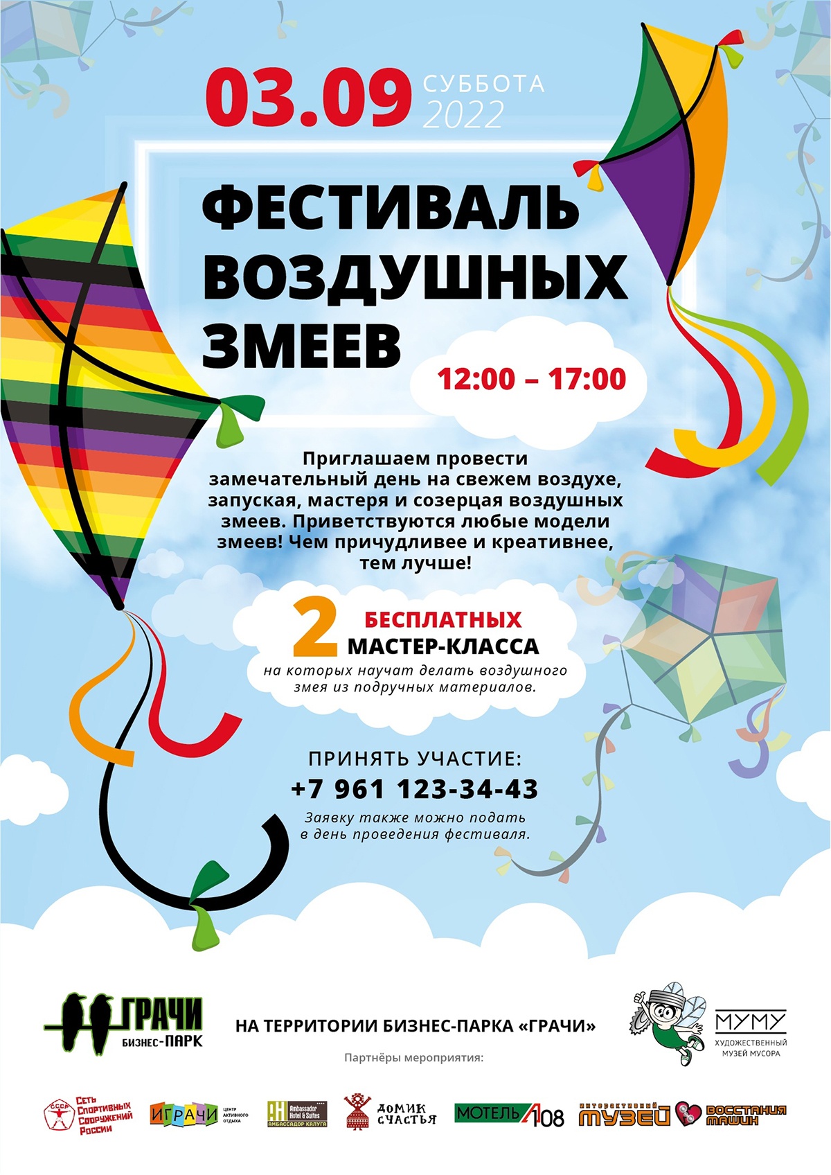 Первая суббота осени для Художественного МУзея МУсора «МУ МУ» уже второй раз знаменуется проведением Фестиваля воздушных змеев. 3 сентября на территории бизнес-парка «Грачи» гости музея будут запускать, мастерить змеев и, конечно, наблюдать за их полетом.