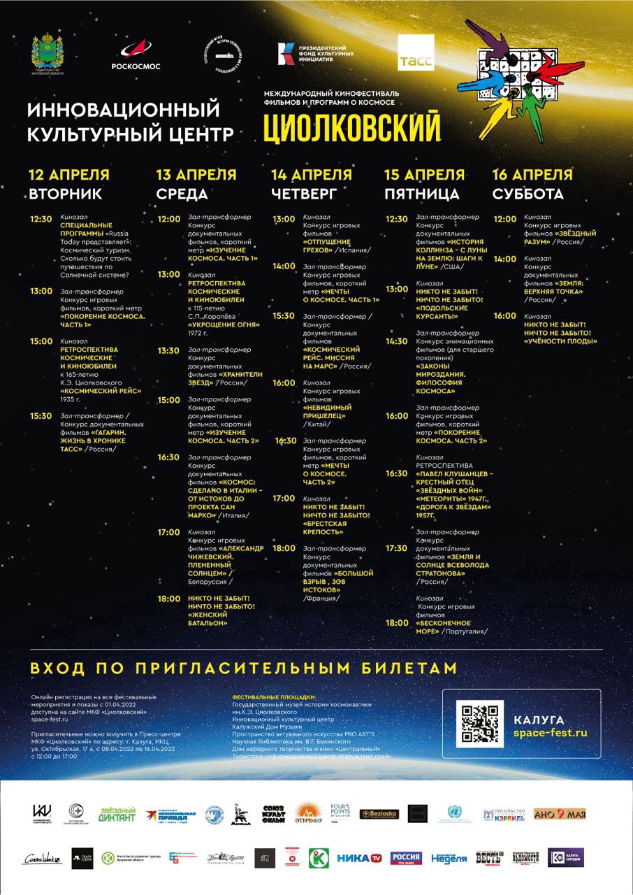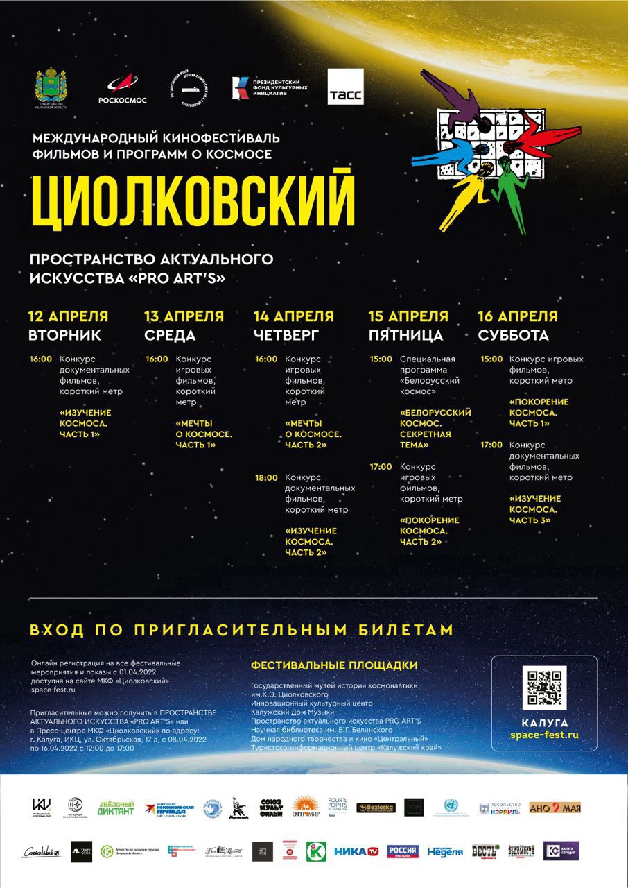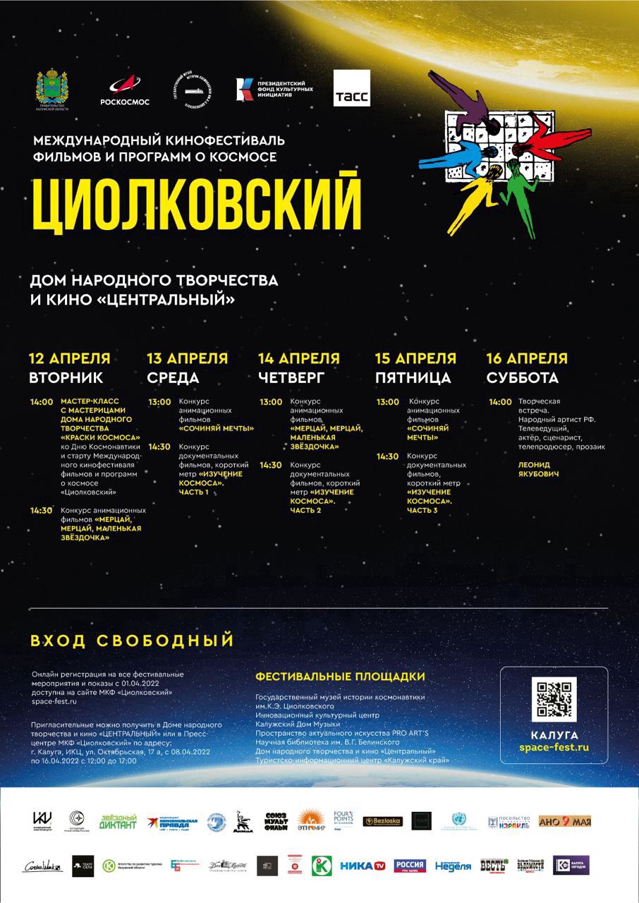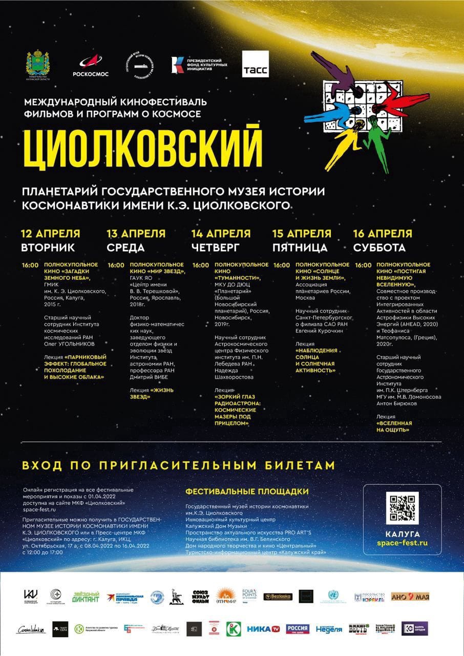 Главным событием празднования Дня космонавтики в Калуге в третий раз станет Международный кинофестиваль фильмов и программ о космосе «Циолковский» 12-16 апреля. В конкурсную программу вошли 80 фильмов – в том числе полнометражные, анимационные, короткометражные, документальные фильмы из 26 стран мира!