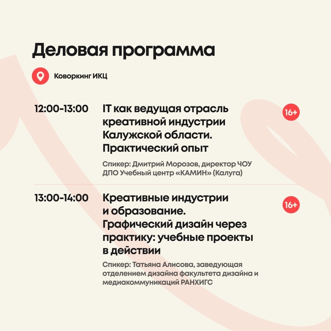 Вход на все мероприятия абсолютно БЕСПЛАТНЫЙ. Не упустите возможность стать частью этого яркого события! Регистрация на мероприятия уже открыта. Давайте вместе создадим атмосферу творчества и вдохновения! kaluga-creativity.ru
