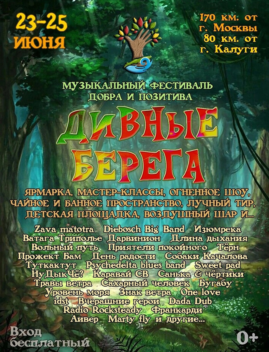 Традиционный опен-эйр для неформалов с позитивным взглядом на вещи проводится в Калужской области с 23 по 25 июня. Гостей музыкального фестиваля добра и позитива «Дивные берега» встретит живописная природа у прекрасной лесной речки, чудесные звуки, в том числе с плавучей сцены, танцы и веселье до рассвета, различные мастер-классы, файер-шоу, утренняя йога, арт-объекты, просмотр анимационных фильмов, чайное и кофейное пространство, локации с разнообразным и вкусным питанием и напитками и многое другое.