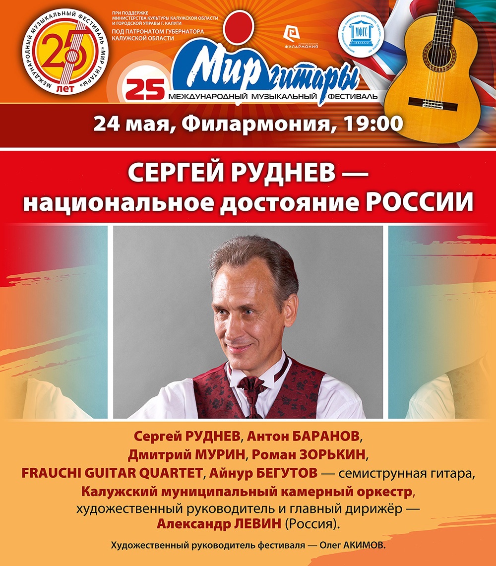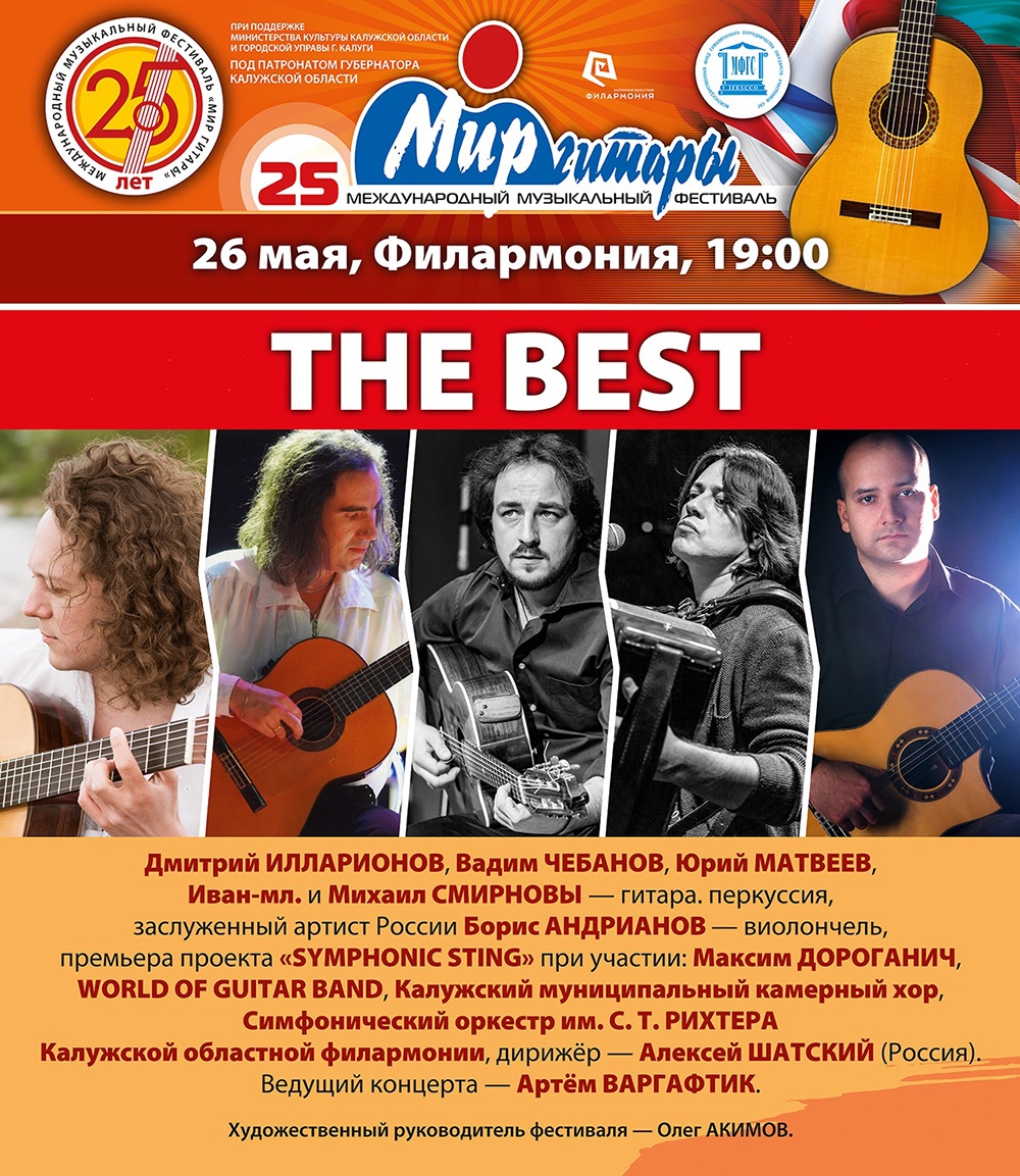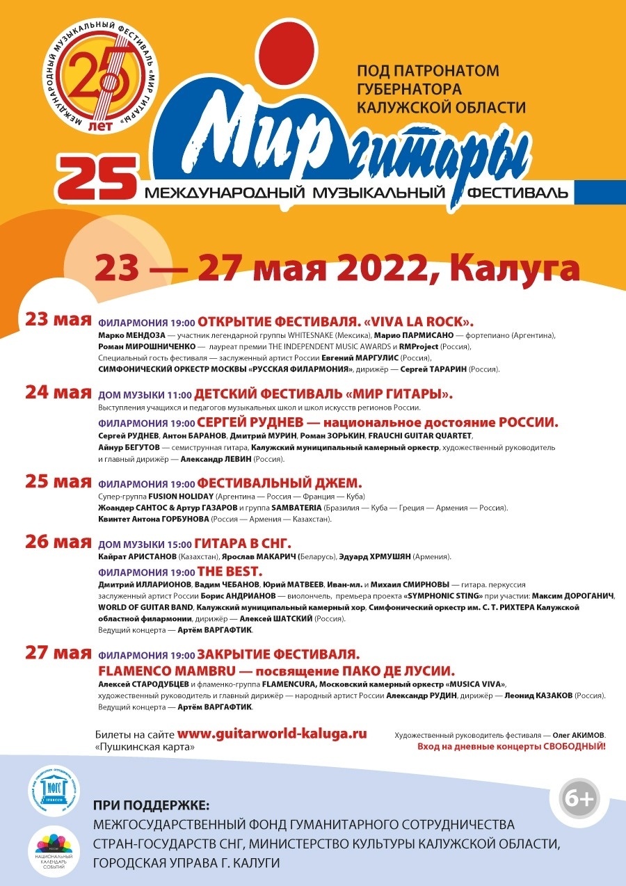 Один из крупнейших гитарных форумов мира в течение пяти дней, с 23 по 27 мая, традиционно представит калужанам самые разные музыкальные жанры, объединив на сцене выдающихся музыкантов со всего мира.