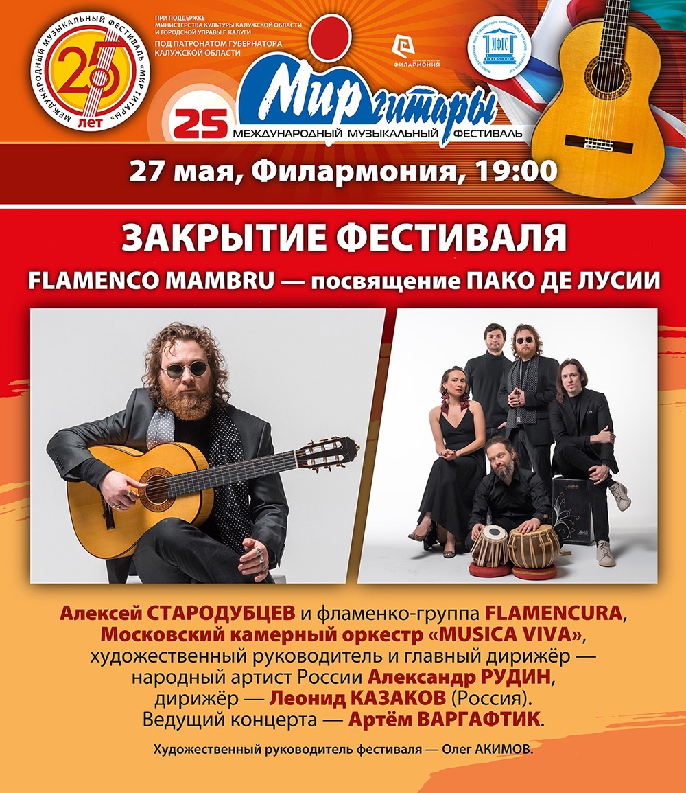 Алексей Стародубцев и лучшая московская фламенко-группа Flamencura при участии постоянного участника фестиваля Московского камерного оркестра «Musica viva» (дирижёр – Леонид Казаков) представят авторскую программу «Flamenco mambru», посвящённую гению фламенко Пако Де Лусии.