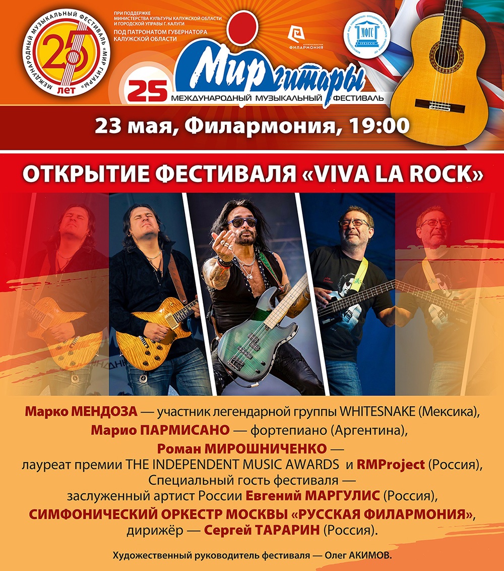 На открытии фестиваля в совместном проекте «Viva La Rock» под аккомпанемент оркестра «Русская филармония» выступят выдающийся аргентинский пианист Марио Пармисано, самый титулованный отечественный гитарист Роман Мирошниченко и всемирно известный бас-гитарист мексиканского происхождения, экс-участник групп Whitesnake и Thin Lizzy Марко Мендоза. Специальным гостей вечера станет заслуженный артист РФ, известный рок-музыкант и популярный телеведущий Евгений Маргулис.