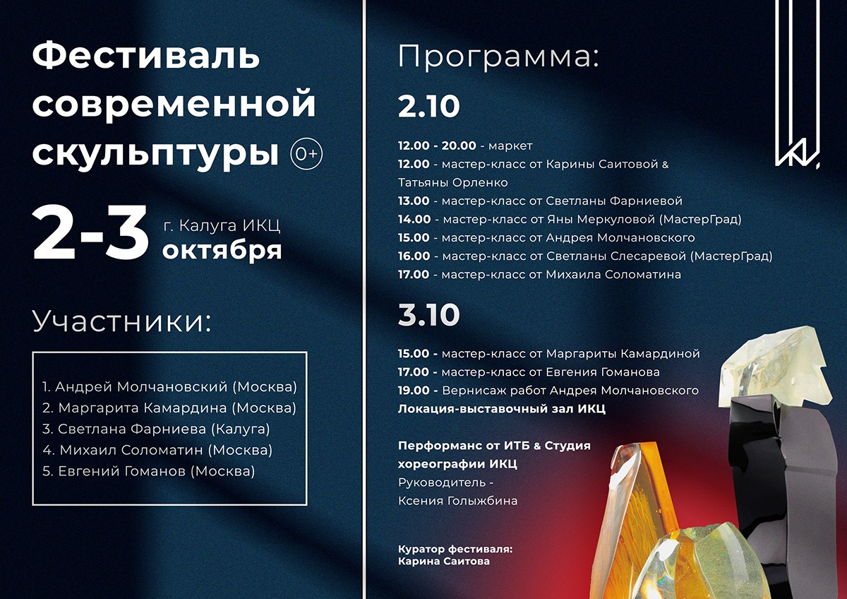 Собаки, рыбки, птички и другие фигурки будут созданы посетителями мастер-классов, которые проведут профессиональные скульпторы в рамках Фестиваля современной скульптуры 2 и 3 октября в Инновационном культурном центре. В программе также маркет, вернисаж работ Андрея Молчановского (Москва), перформанс от Инновационного театра балета.
