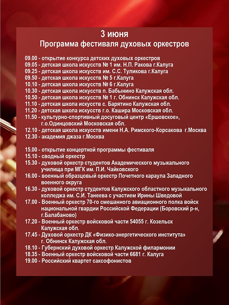 В рамках фестиваля также запланированы выездные выступления детских и юношеских духовых оркестров на местах воинской славы Калужской области – на Безымянной высоте, Зайцевой горе, Площади Победы в Калуге, на территории музея «Ильинские рубежи», военно-мемориальных комплексов Юхнова и Кондрова и в других местах.