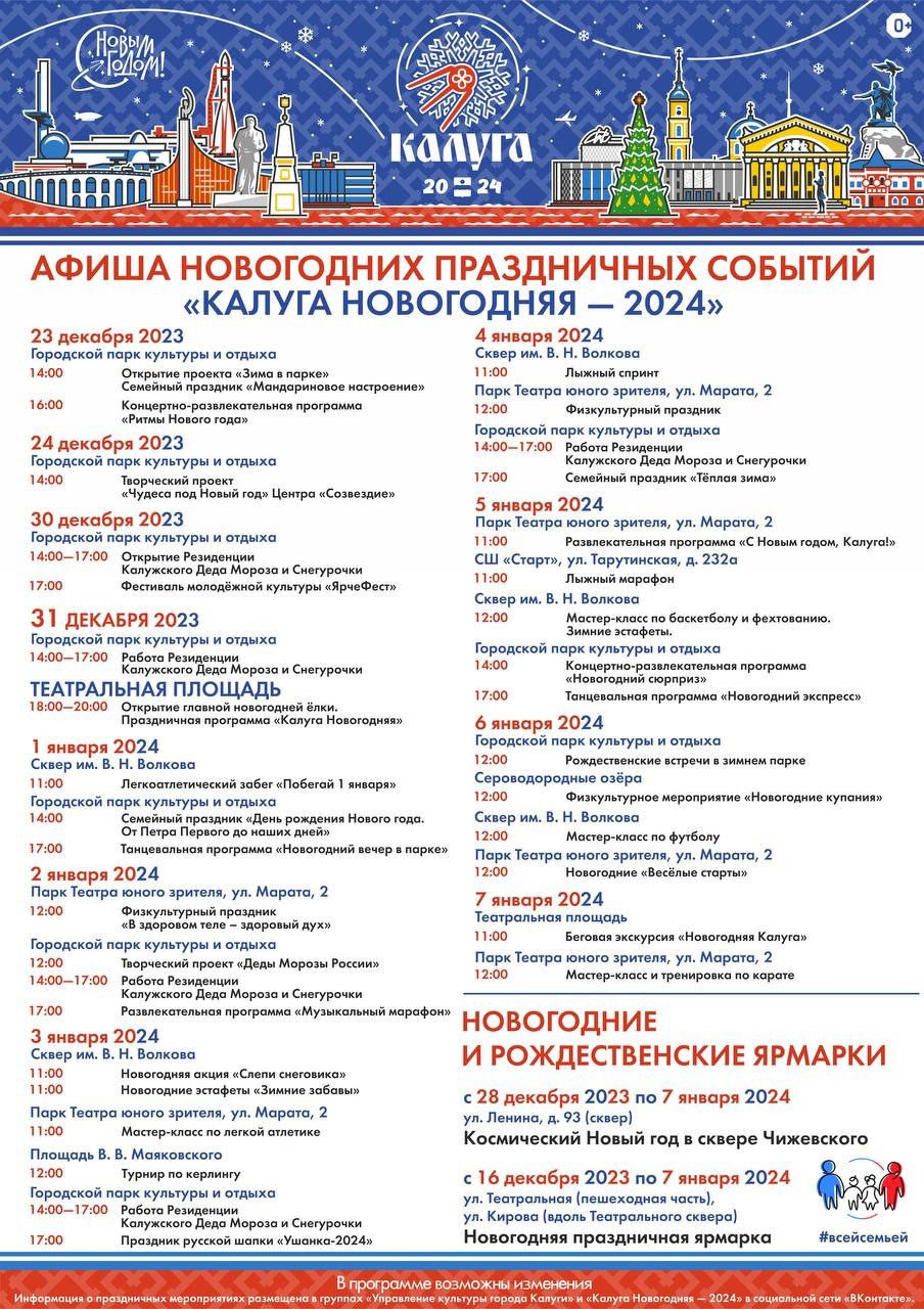 Новогодняя афиша в областном центре стартует уже 16 декабря – начинает работу праздничная ярмарка. И до окончания новогодних каникул 8 января калужан и гостей колыбели космонавтики ждут концерты и спектакли, экскурсии и квесты, катание на коньках и сеансы в планетарии. Главная городская новогодняя ёлка украшает Театральную площадь – её открытие, как и основная праздничная программа, состоится 31 декабря в 18:00.