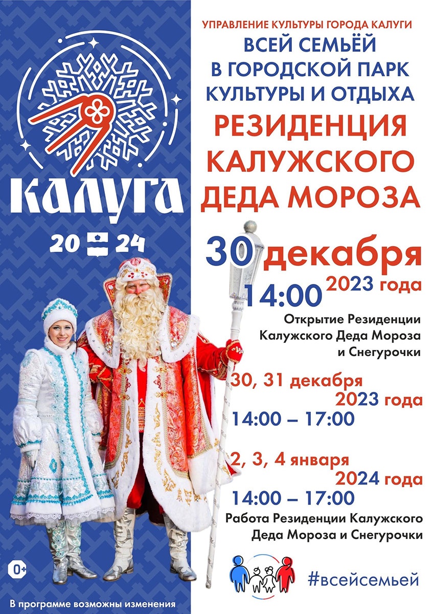 - С 30 по 31 декабря, с 2 по 4 января 14-00 – 17-00 – Резиденция Калужского Деда Мороза и Снегурочки. Посещение бесплатное и без предварительной записи.