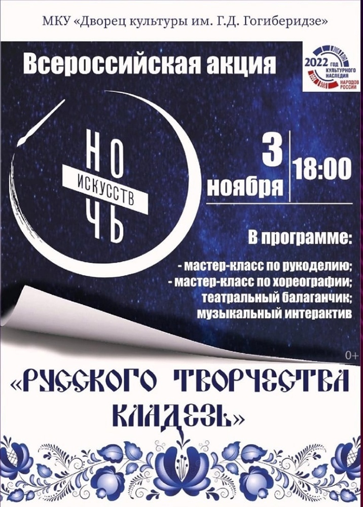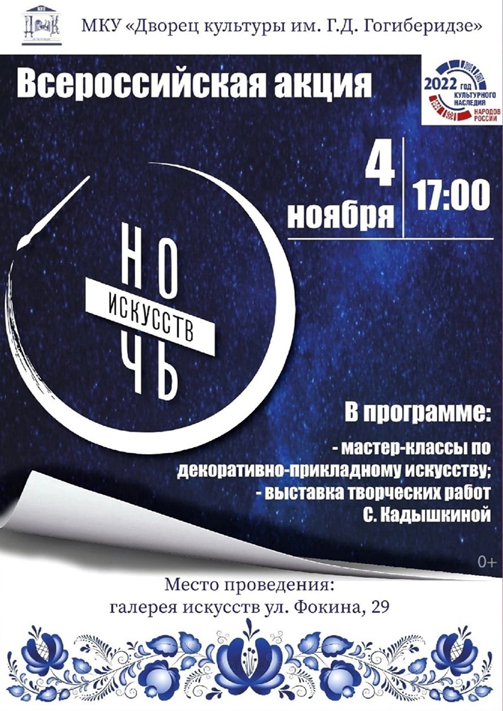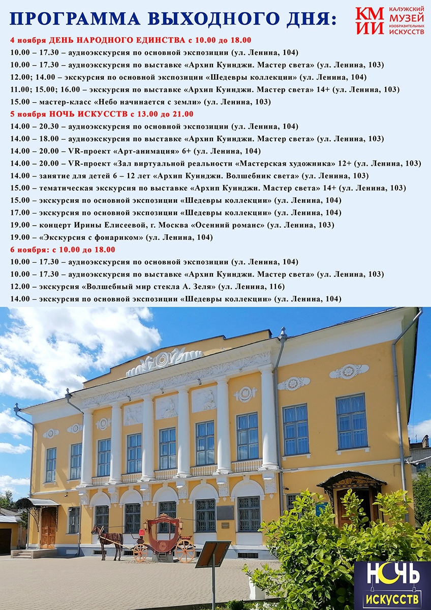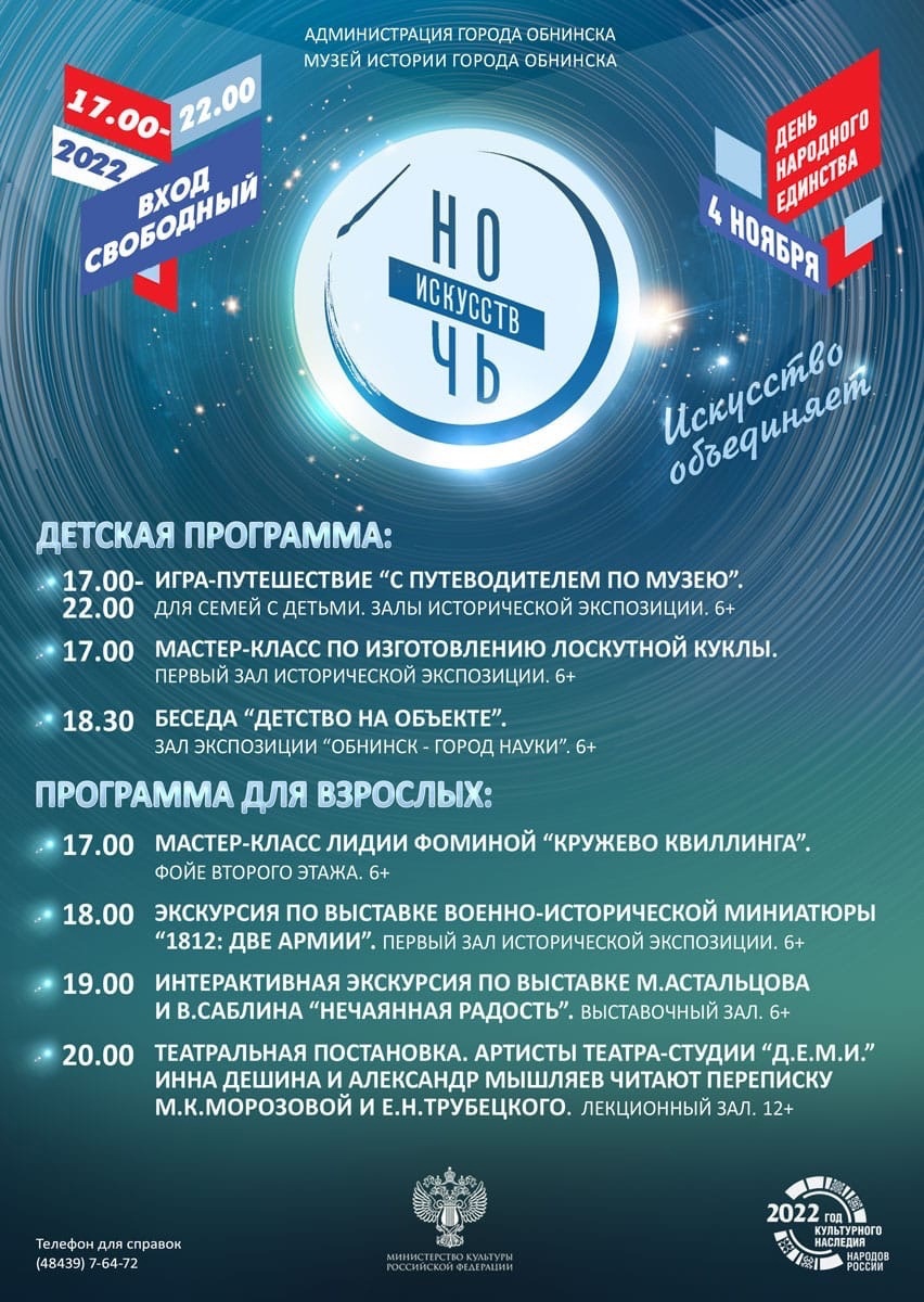 4 ноября в России уже традиционно проводится акция Ночь искусств. Калужские дома культуры, концертные залы и музеи предлагают посетителям специальные программы в этот день. Тема акции в 2022 году - "Искусство объединяет".