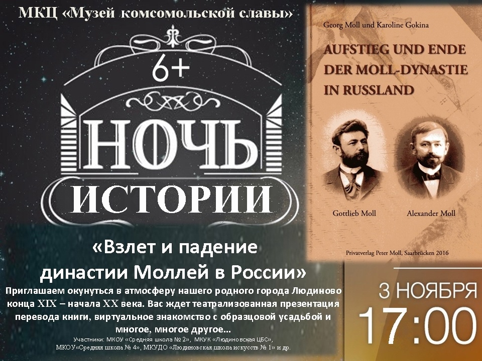В Людиновском музее на набережной посетителей приглашают на акцию 3 ноября в 17:00: здесь пройдет театрализованная презентация книги "Взлет и падение династии Моллей в России". Проведут акцию и в Доме культуры Гогиберидзе: там приглашают 3 ноября в 18 часов и 4 ноября в 17 часов.