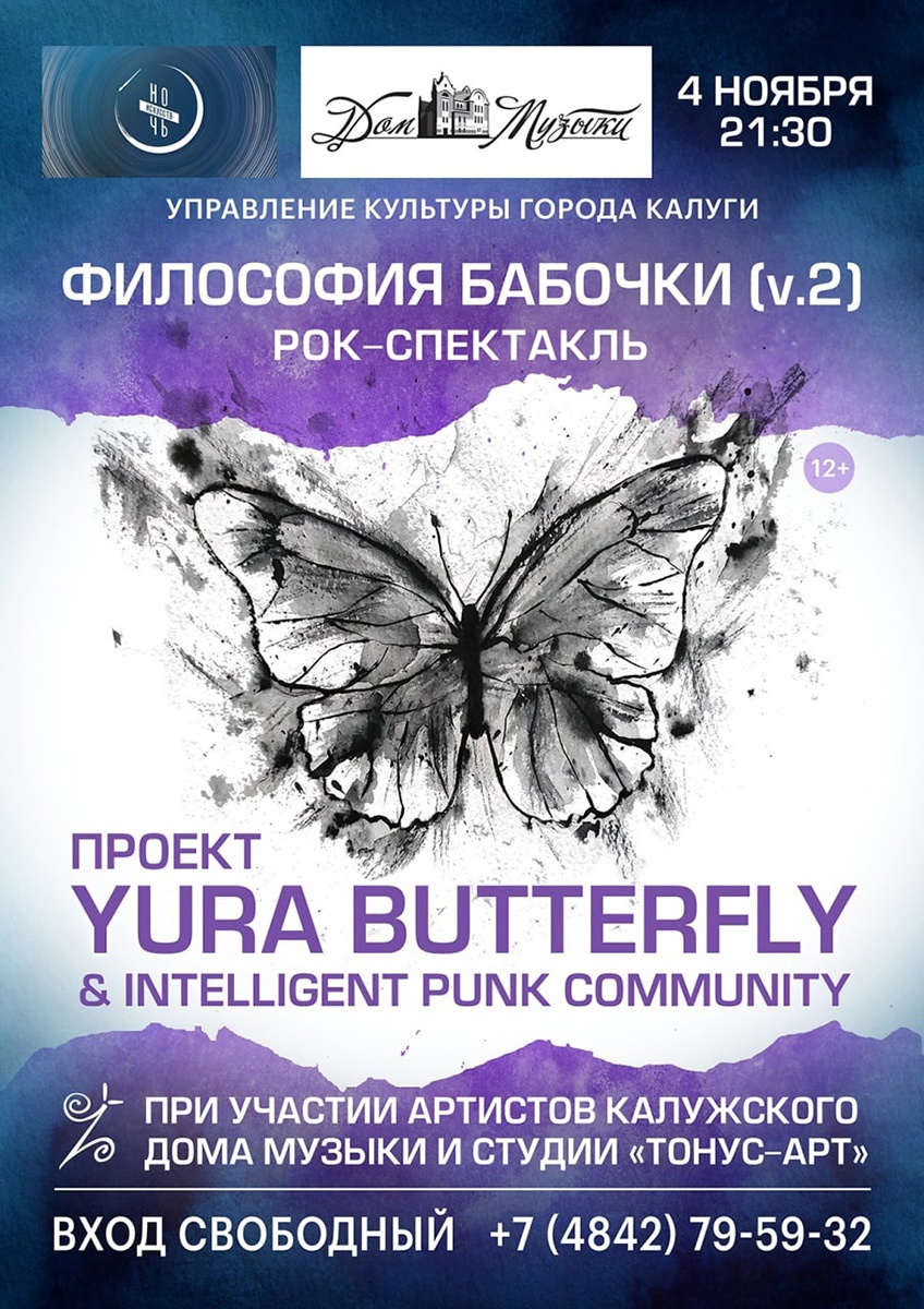 - Говорят, взмах крыла бабочки способен вызвать торнадо за сотни, а то и тысячи километров. Но значит, он также способен дать жизнь волне счастливых перемен. В Калужском доме музыки предложат разгадать «Философию бабочки» - так называется рок-программа от проекта YURA BUTTERFLY. Начало в 21:30.