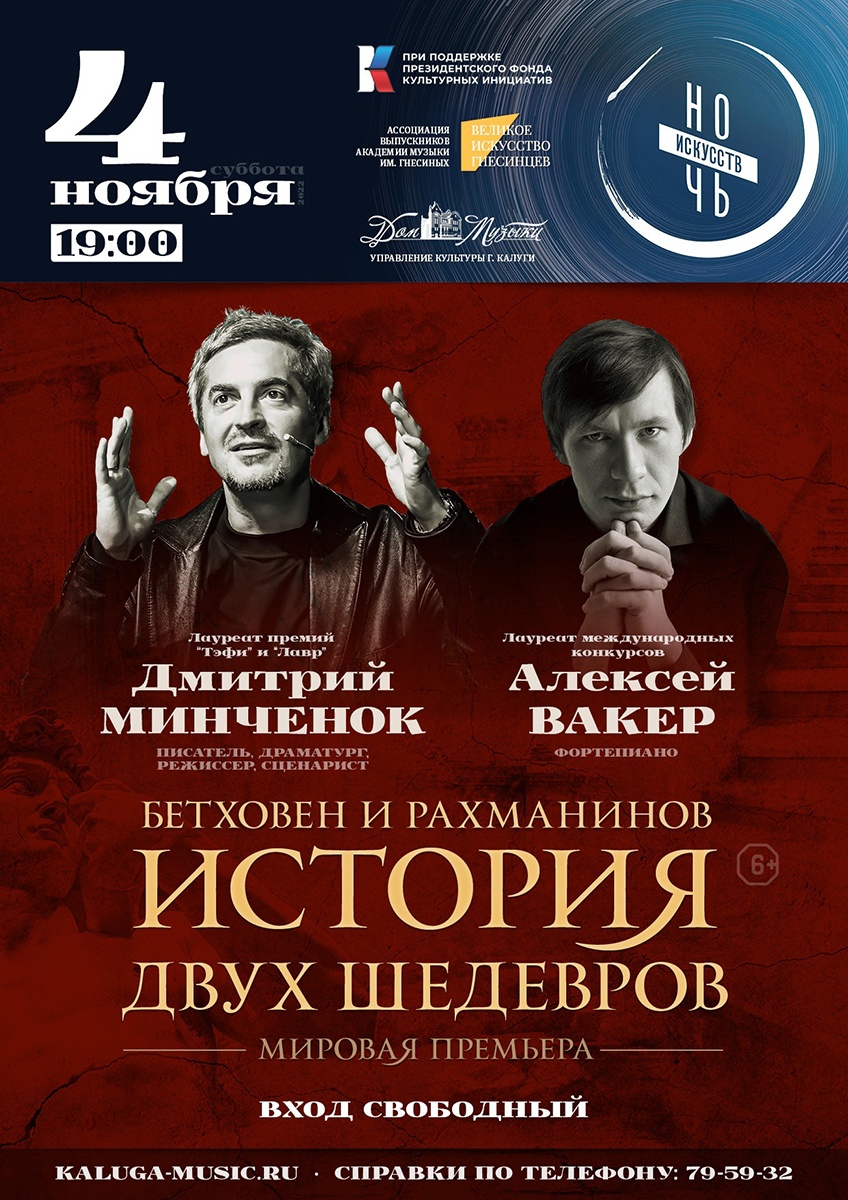 - В 19.00 детское представление сменит драматическая импровизация «Рахманинов и Бетховен. История двух шедевров». Её авторы также представят свой взгляд на творчество двух известных композиторов. В гости к калужанам приедут москвичи: писатель и режиссёр Дмитрий Минченок и пианист Алексей Вакер. Вход свободный.