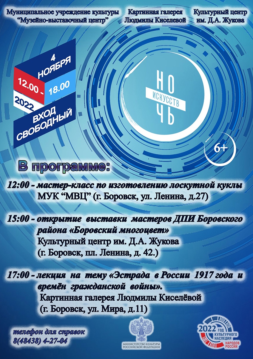 4 ноября Калужский филиал Музея Победы – "Музей Г.К. Жукова" присоединится к всероссийской акции "Ночь искусств". Вход на экспозиции будет бесплатным для всех желающих с 17:00 до 22:00. Организаторы подготовили программу, в которой преобладает народное искусство. Это и декоративно-прикладное творчество, ремесла и фольклор. В рамках акции в 20:00 пройдет открытие выставки "Калужская перевить". Посетителям представят образцы калужской традиционной вышивки и костюма из фондов Музея Жукова. Затем гостей пригласят на вечер песни "Русская душа", где прозвучат русские народные и любимые всеми советские песни, частушки. Завершит вечер русский хоровод.