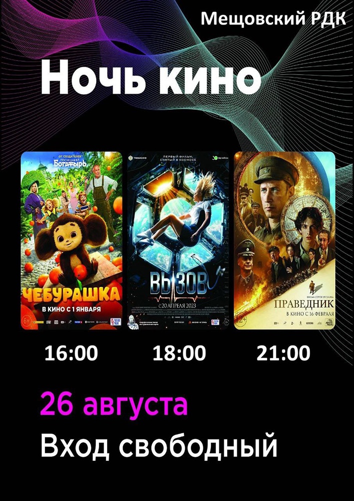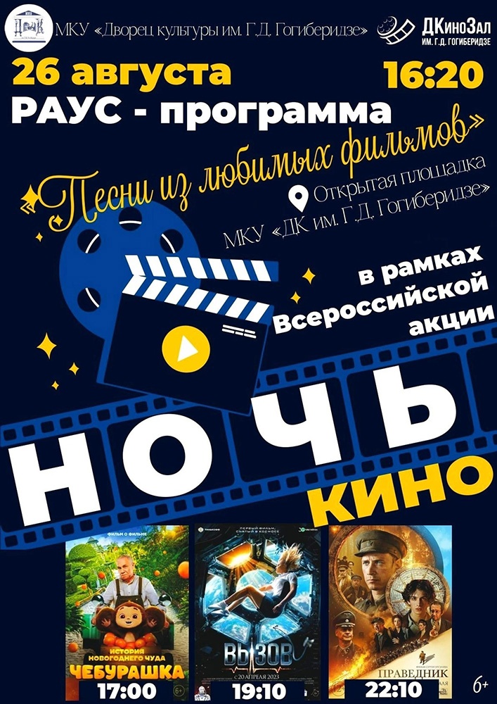Ежегодная всероссийская акция «Ночь кино», приуроченная ко Дню российского кино, пройдет уже в восьмой раз. Открытые кинотеатры, концертные программы и показы известных кинокартин ожидаются 26 августа во всех регионах страны. Основу программы 2023 года составляют три самых кассовых отечественных картины 2023 года: «Чебурашка» (реж. Дмитрий Дьяченко), «Вызов» (реж. Клим Шипенко), «Праведник» (реж. Сергей Урсуляк). Что еще приготовила Ночь кино для калужан и гостей региона?