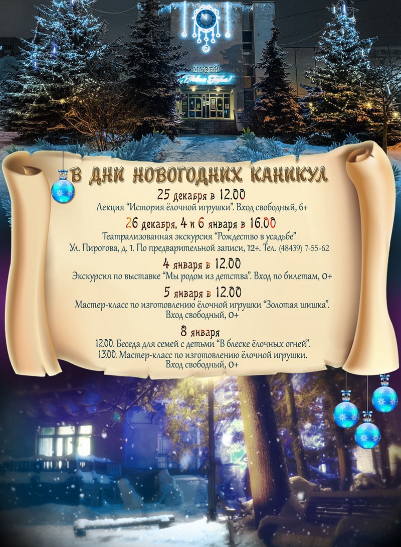 2 января в 17:00 в Доме ученых можно посмотреть балет «Щелкунчик», а 4 января в 19:00 – концерт Михаила Бублика. Музей истории города приглашает на экскурсию по выставке «Мы родом из детства» и мастер-классы по изготовлению елочных игрушек.