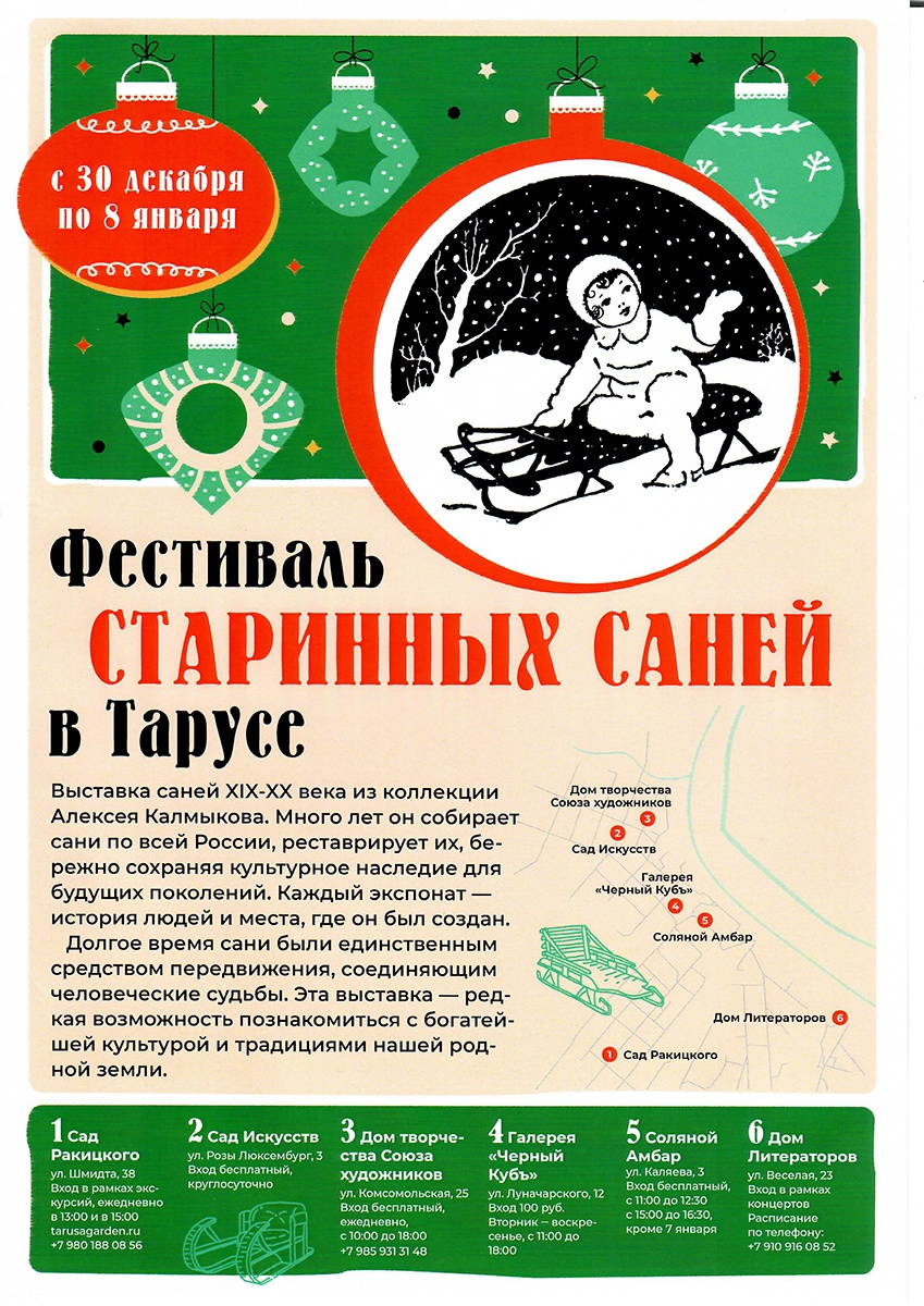 - Открытие фестиваля уникальных старинных саней XIX-XX века из коллекции Алексея Калмыкова. Много лет он находит, покупает и реставрирует старинные сани, бережно сохраняя культурное наследие для будущих поколений